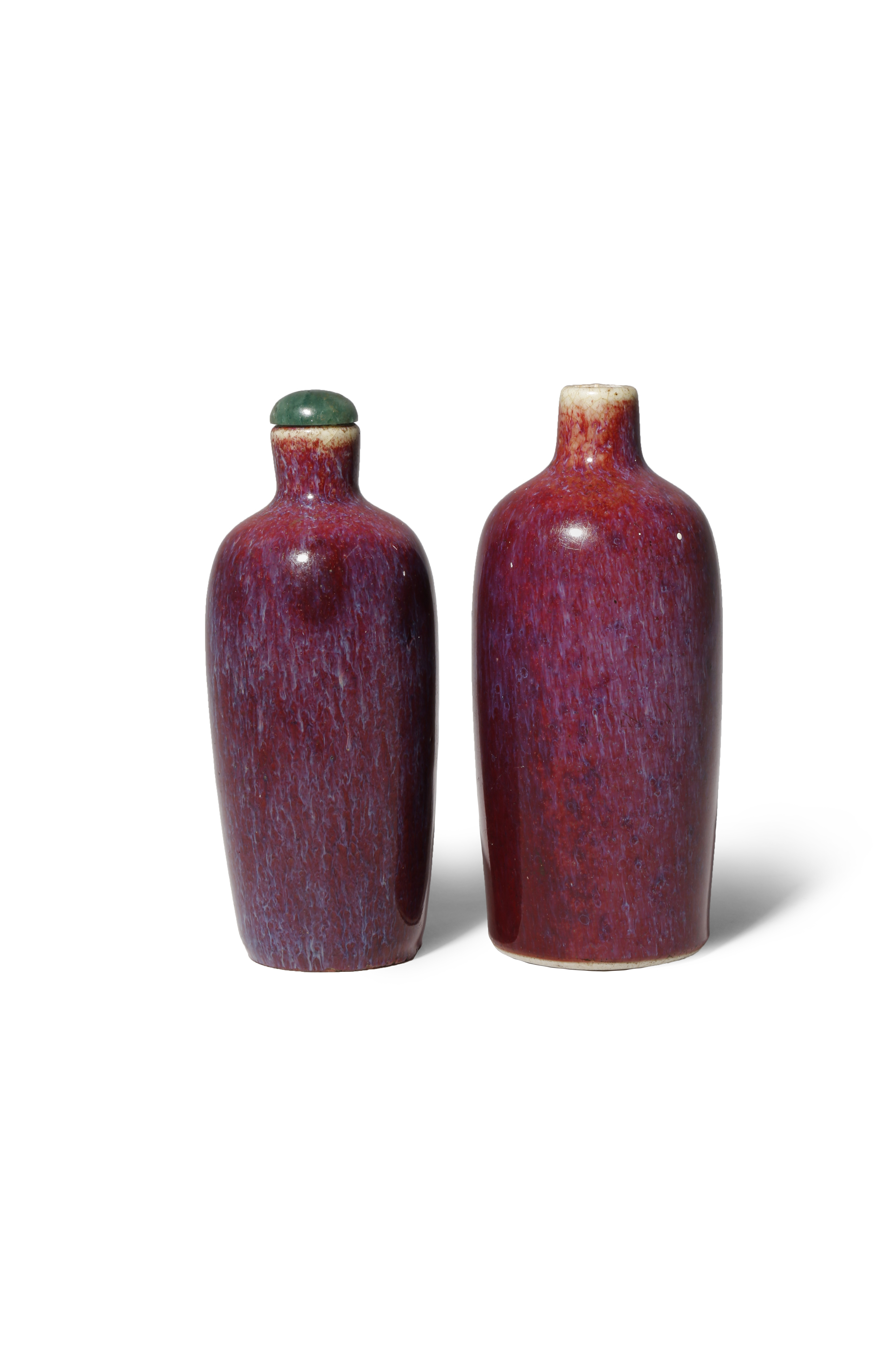 TWO LARGE CHINESE FLAMBE GLAZED SNUFF BOTTLES 18TH/19TH CENTURY Each with an ovoid body rising to...