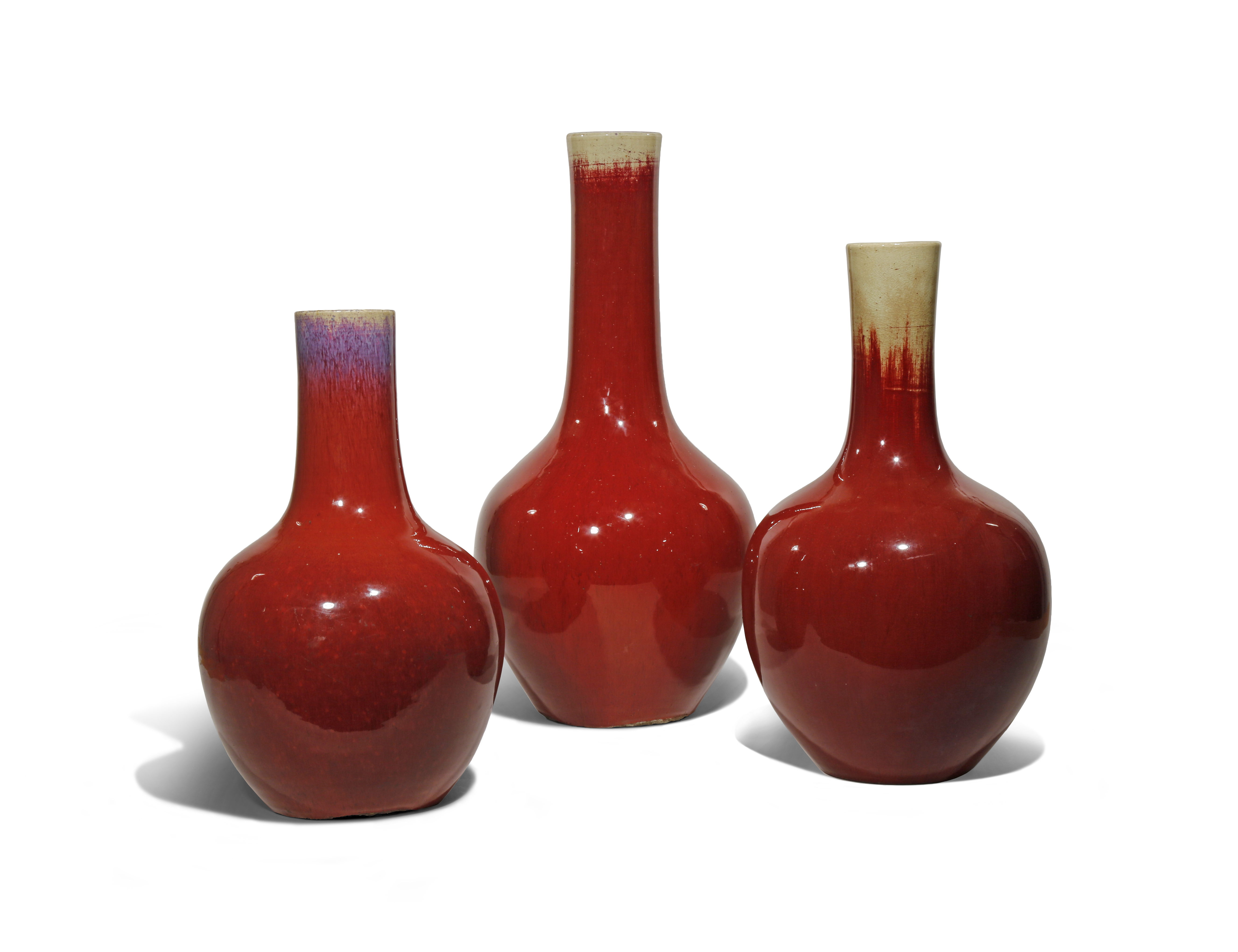 Each with an ovoid body rising to a tall cylindrical neck, decorated with a deep red glaze which thins to brown towards the mouth rims, the neck of the smallest vase with streaks of vibrant lavender and the largest with hints of a rich magenta, the base of each washed with a thin brown glaze, 55.5cm. (3)