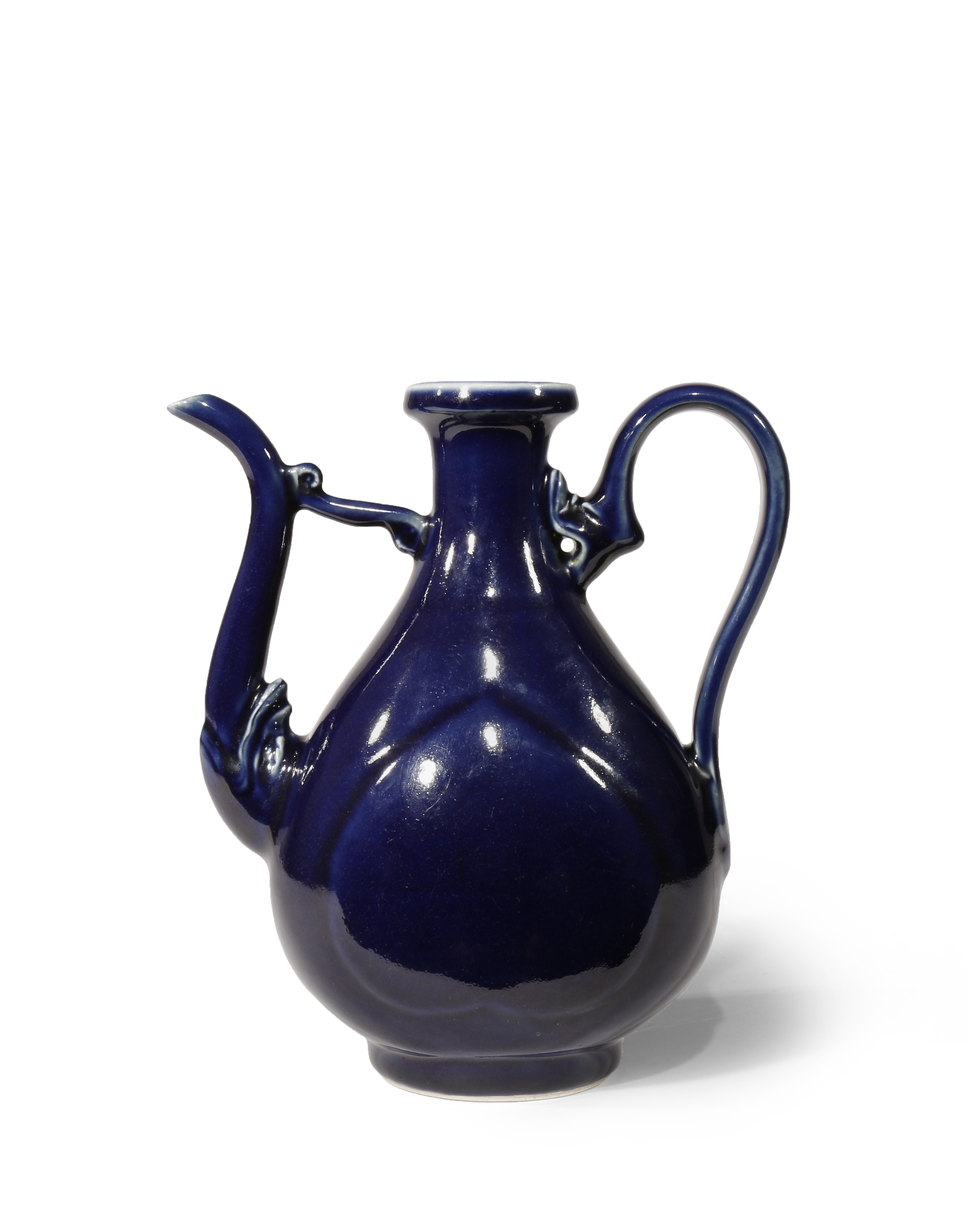The pear-shaped body covered with a deep blue glaze draining from the rim, moulded with a large raised peach-shaped panel to each side, the loop handle and S-shaped spout with animal masks, all supported on a straight circular foot, 22.6cm.