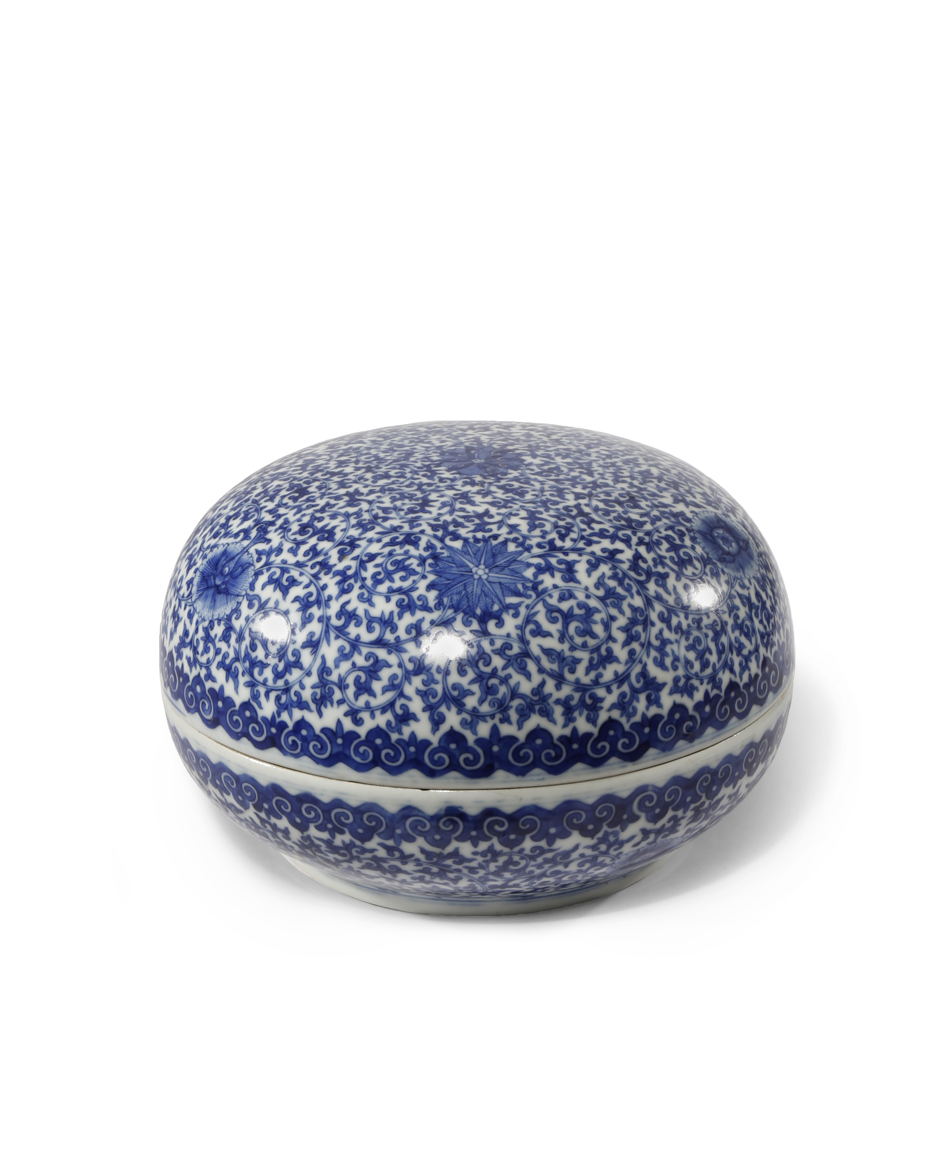 A CHINESE BLUE AND WHITE CIRCULAR BOX AND COVER 19TH CENTURY Painted with flowerheads and...