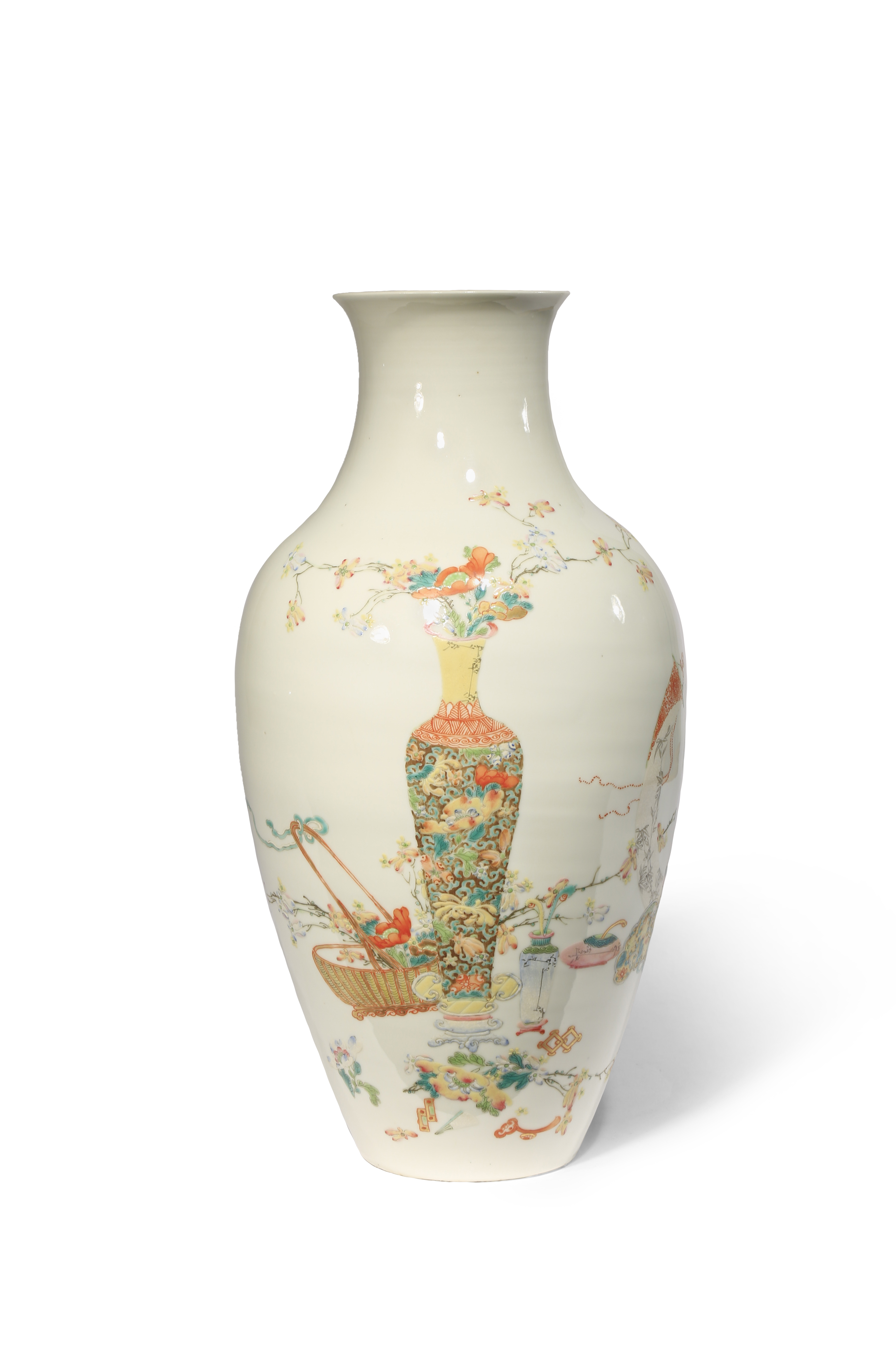 A CHINESE FAMILLE ROSE 'PRECIOUS OBJECTS' VASE REPUBLIC PERIOD The ovoid body rising to a flaring...