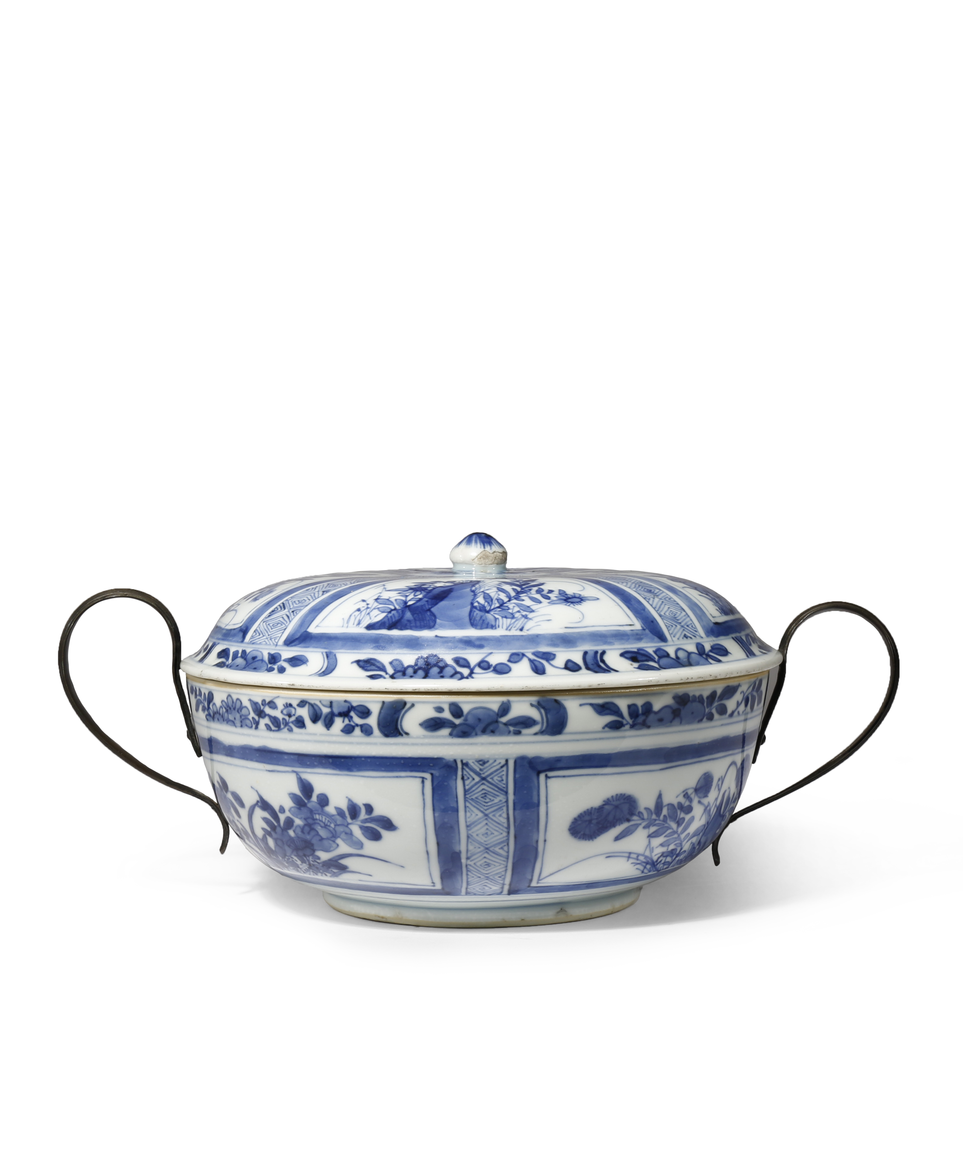 A CHINESE BLUE AND WHITE SILVER-MOUNTED ECUELLE AND COVER KANGXI 1662-1722 Painted with panels...