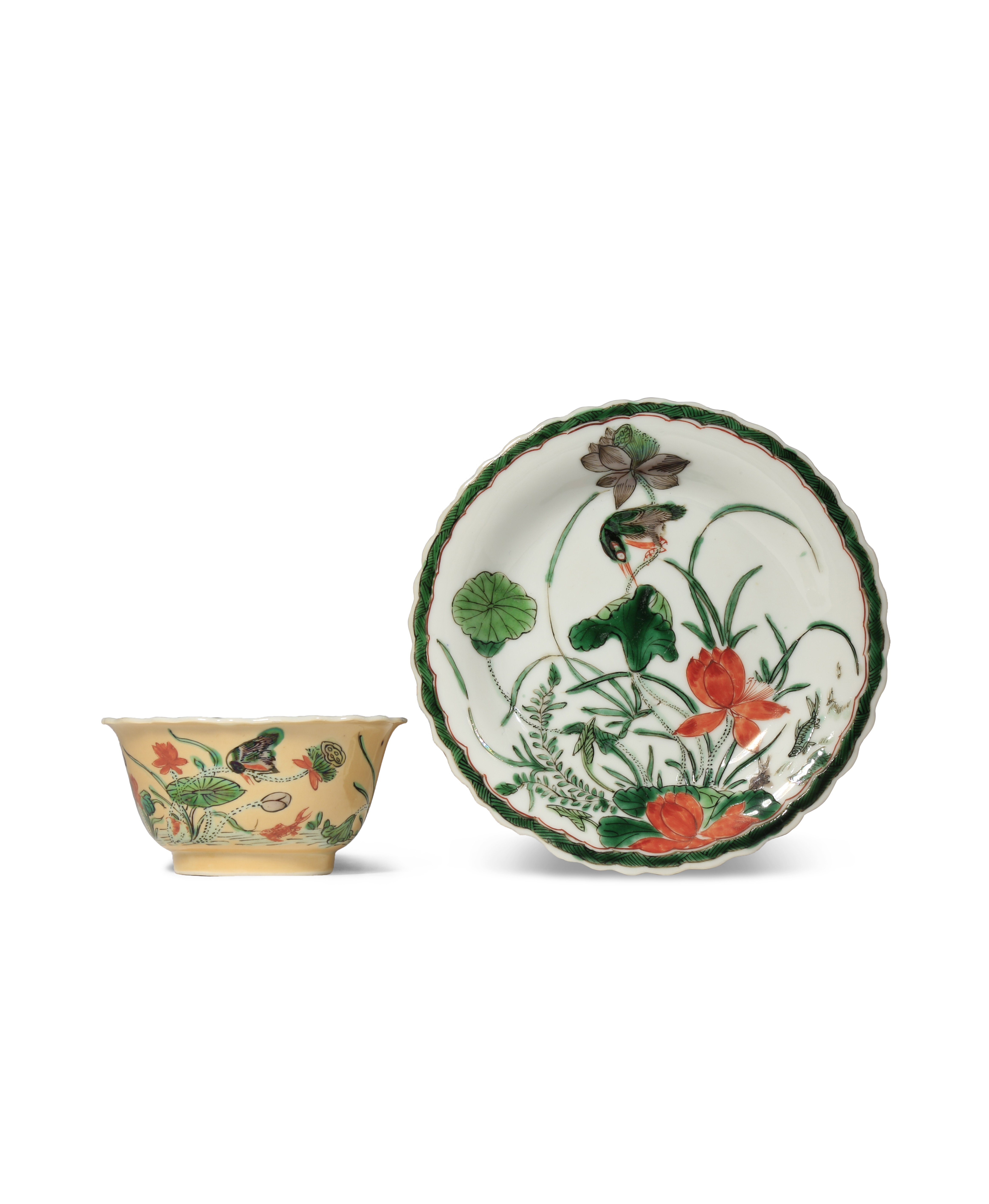 A CHINESE FAMILLE VERTE CAFE-AU-LAIT GROUND TEA BOWL AND SAUCER KANGXI 1662-1722 Each painted in...