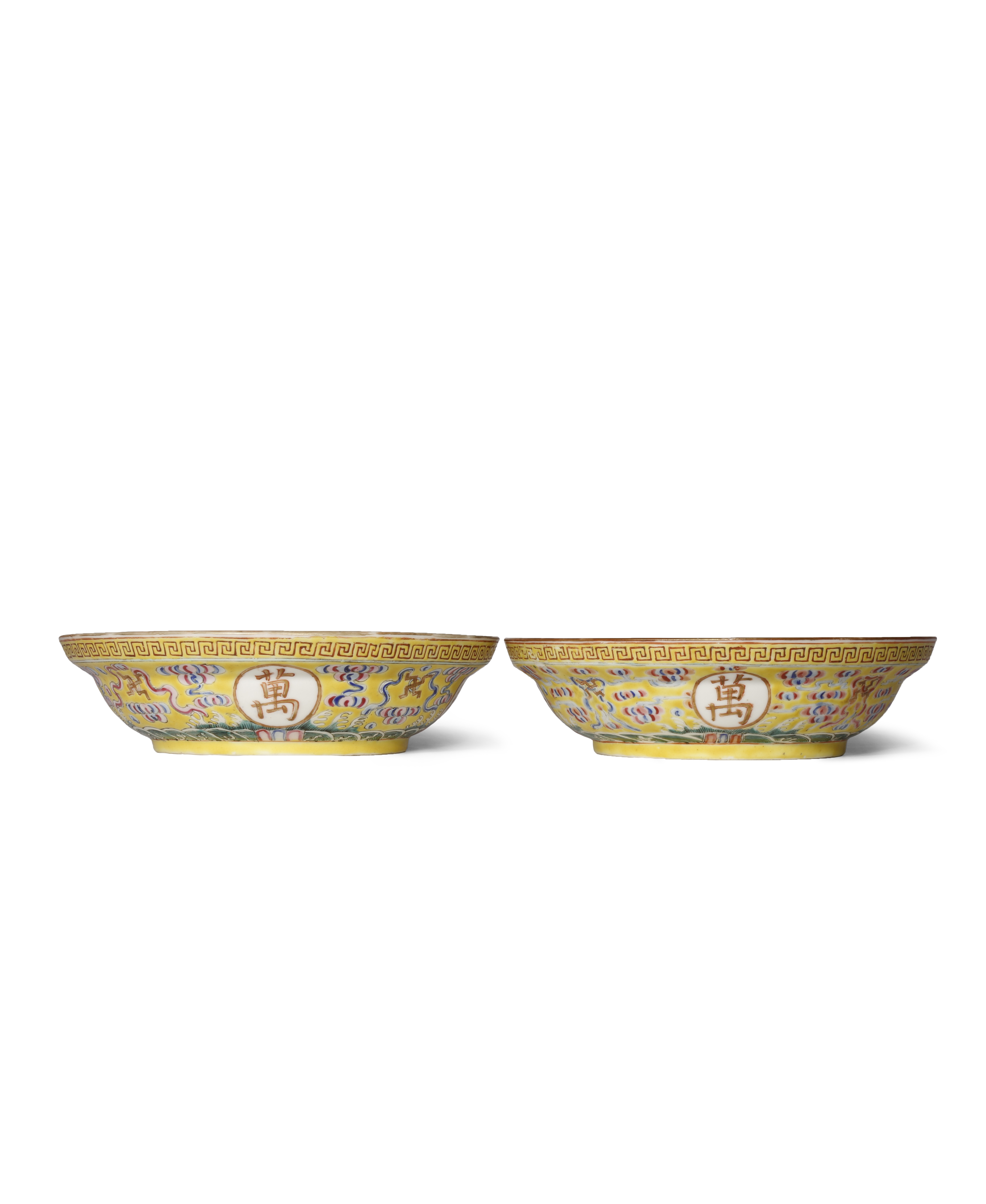 Each painted in enamels and gilt with fylfots and four roundels containing characters above a band of breaking waves, all against a bright yellow ground, the centre of each decorated with five bats encircling a shou character, 16cm. (2)