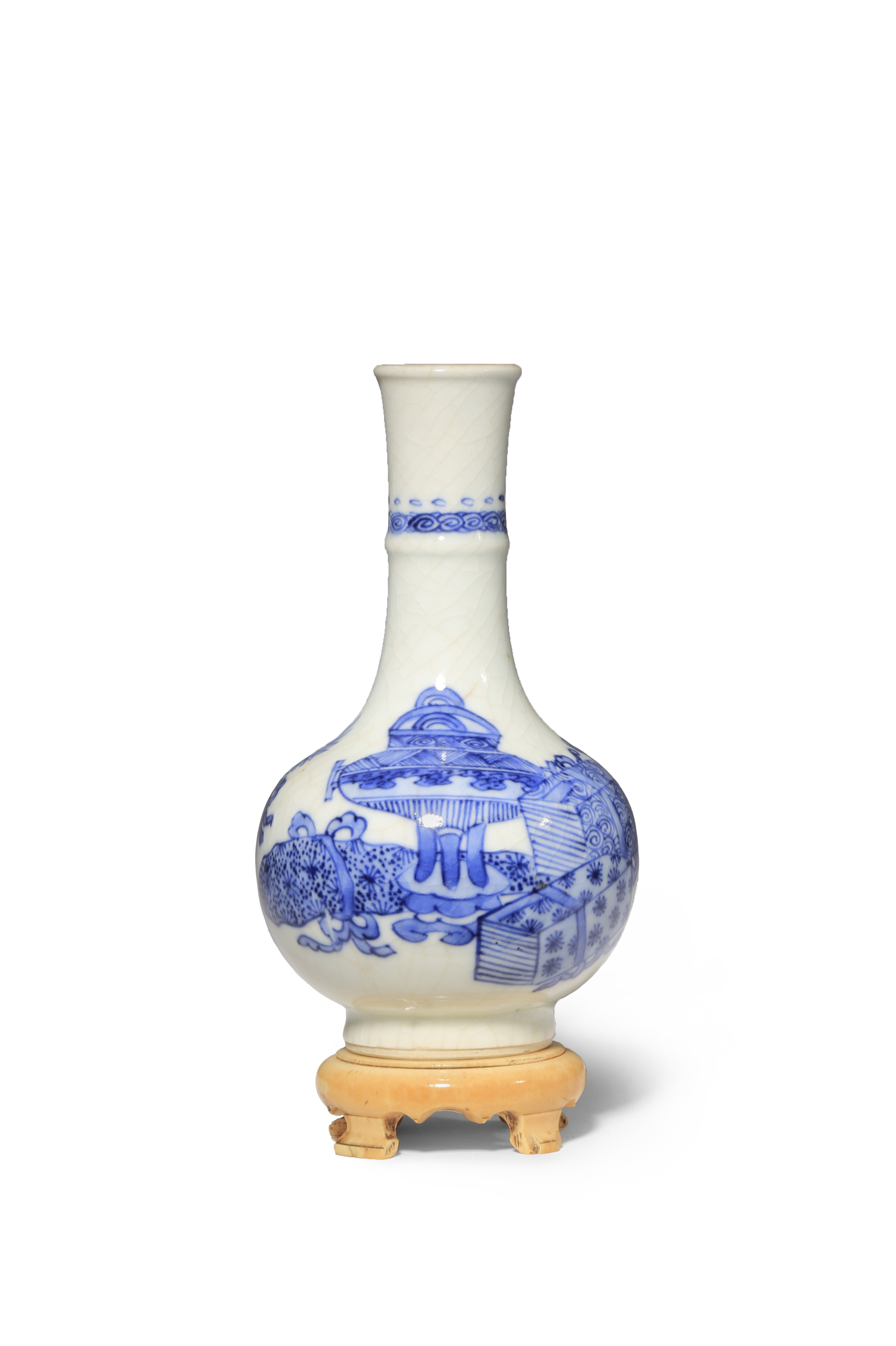 λ A SMALL CHINESE SOFT-PASTE BLUE AND WHITE BOTTLE VASE KANGXI 1662-1722 Painted with archaistic...