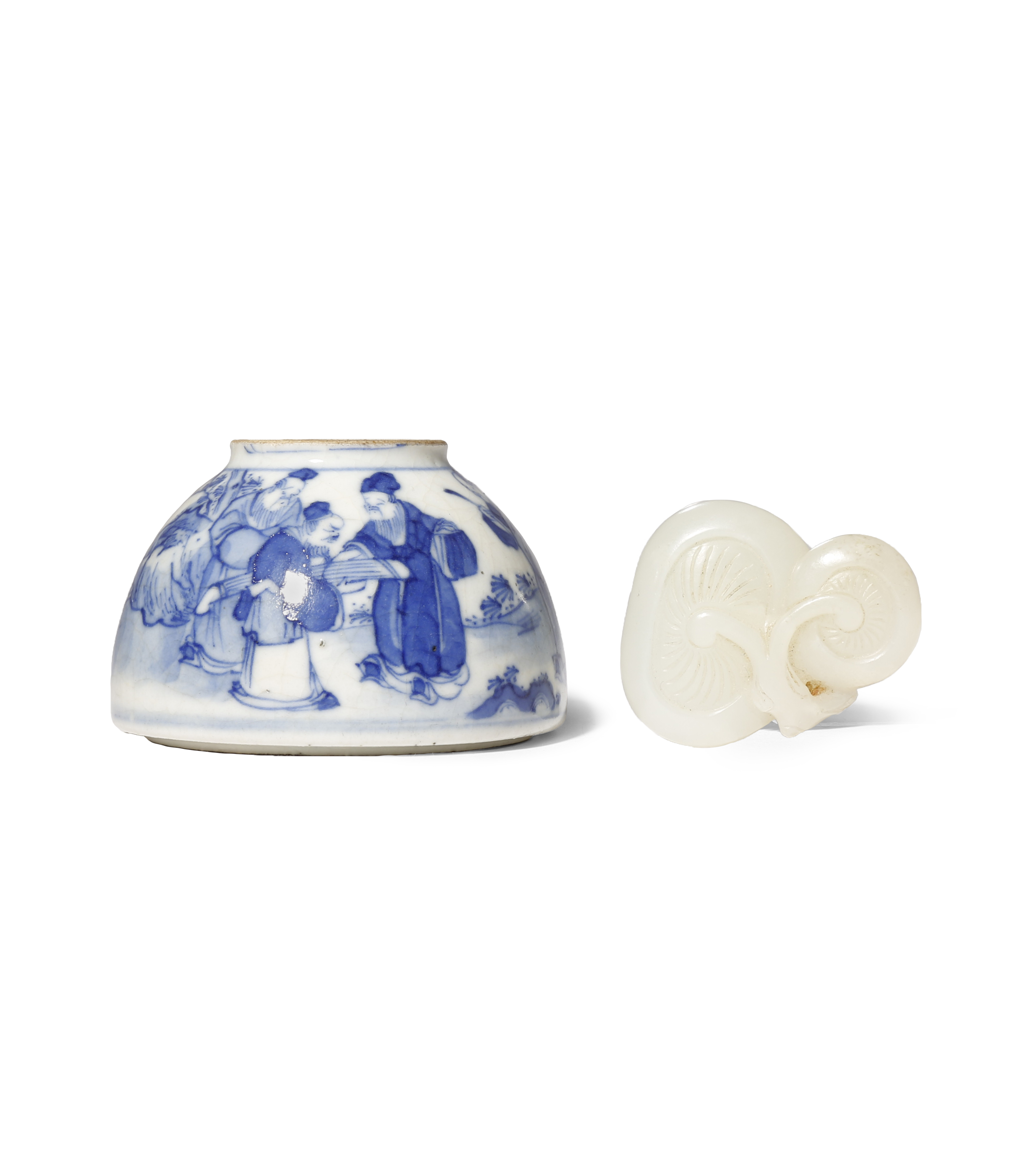 A CHINESE BLUE AND WHITE SOFT-PASTE WATERPOT AND A SMALL JADE CARVING 18TH CENTURY The waterpot...