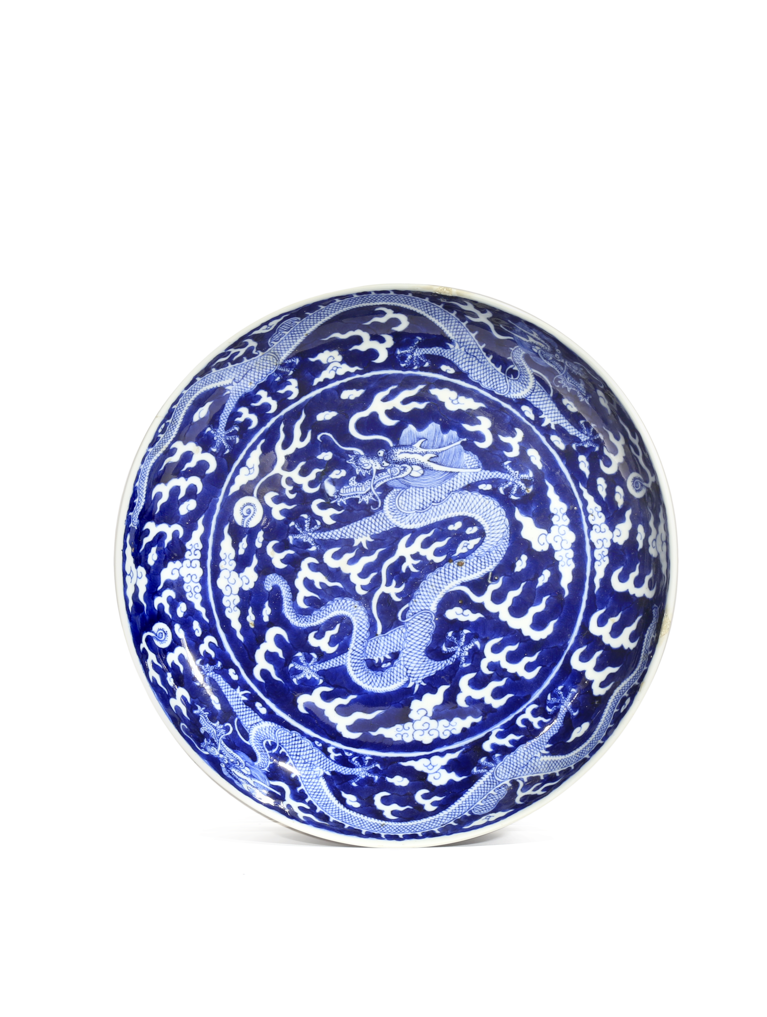 Painted to the centre with a dragon in pursuit of a sacred pearl amidst stylised flames and clouds, surrounded by two dragons also chasing flaming jewels, with a further two dragons above a band of lappets to the exterior, all against a blue ground, 25.2cm.