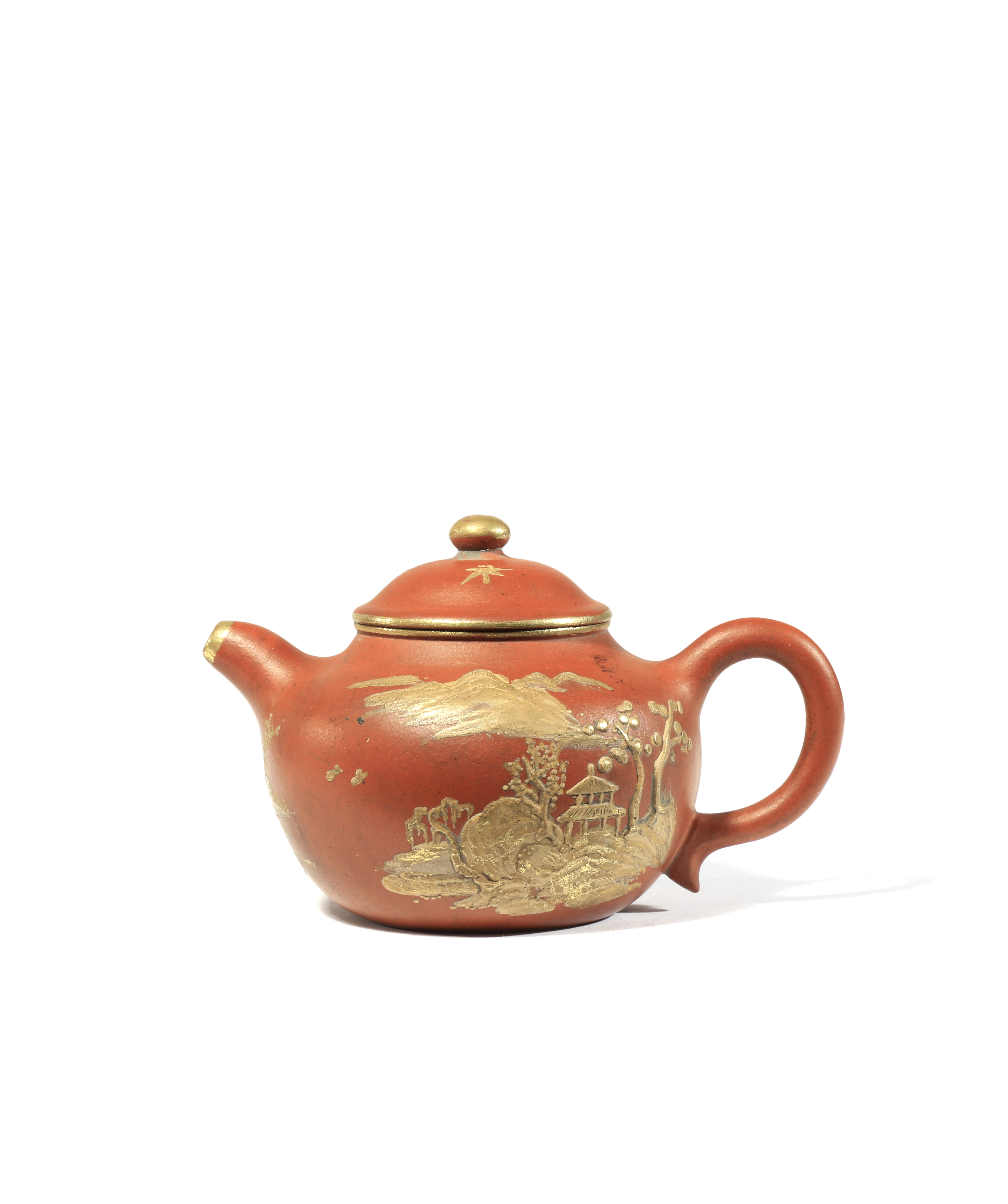 AN UNUSUAL CHINESE GILT-LACQUER DECORATED SMALL YIXING TEAPOT AND COVER 18TH CENTURY Decorated in...