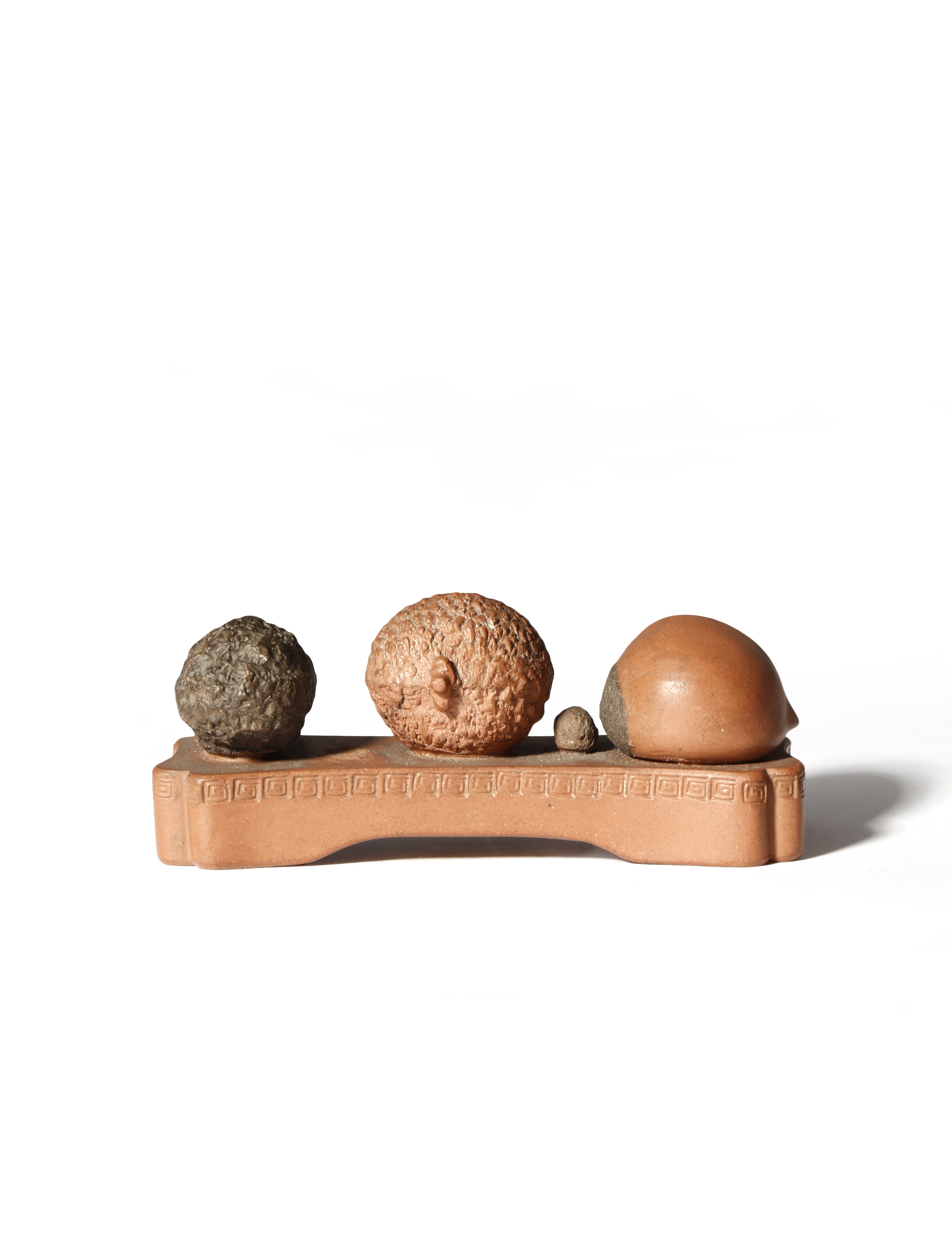 Formed as a chestnut, a lychee, a date and a peanut raised on a shaped base, with a band of key fret incised around the edge, the underside impressed with two seal marks reading Chen Ming Yuan, 8.6cm.
