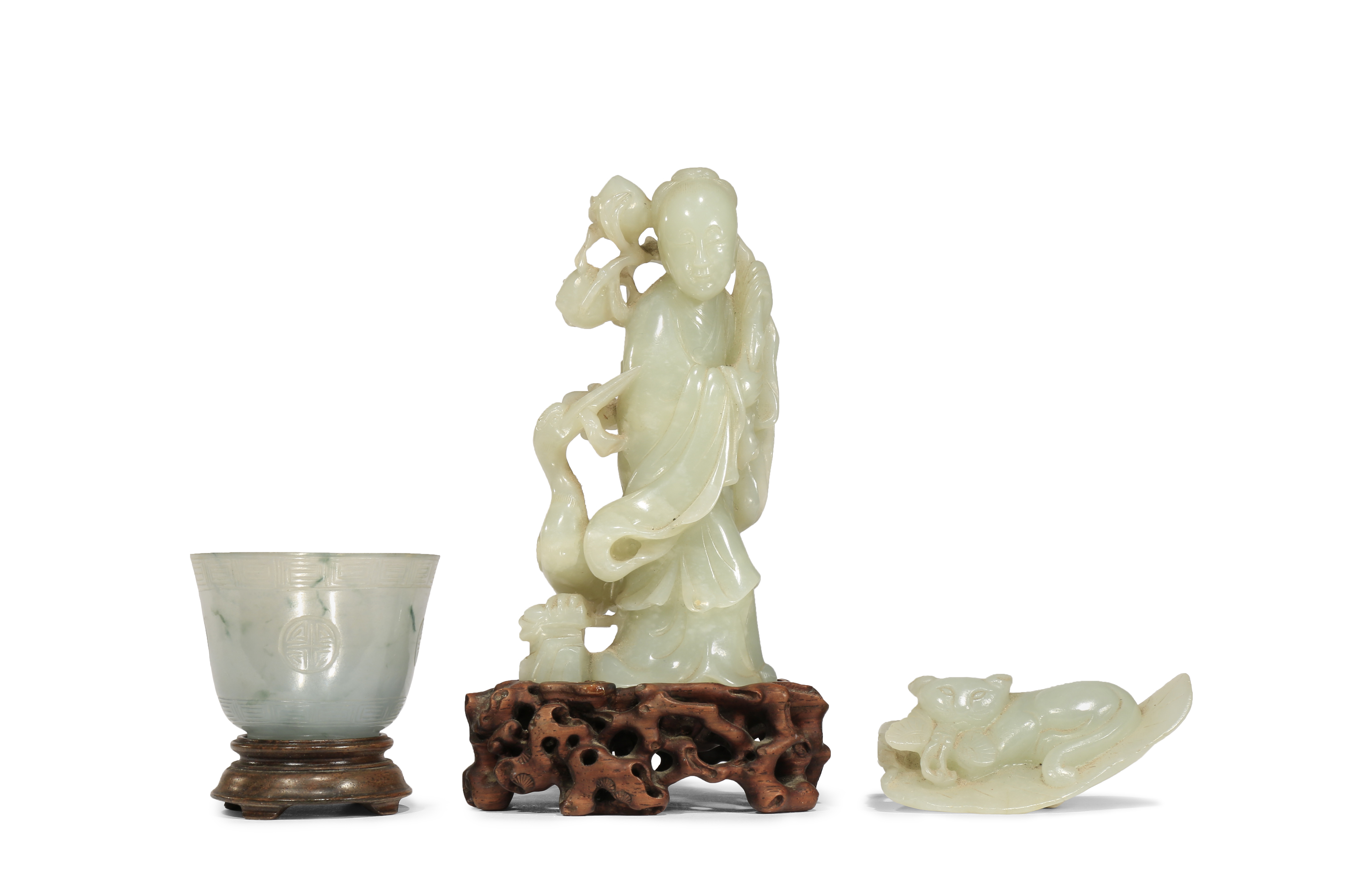 TWO CHINESE PALE CELADON JADE CARVINGS AND AN AGATE CUP QING DYNASTY One carving of a lady...