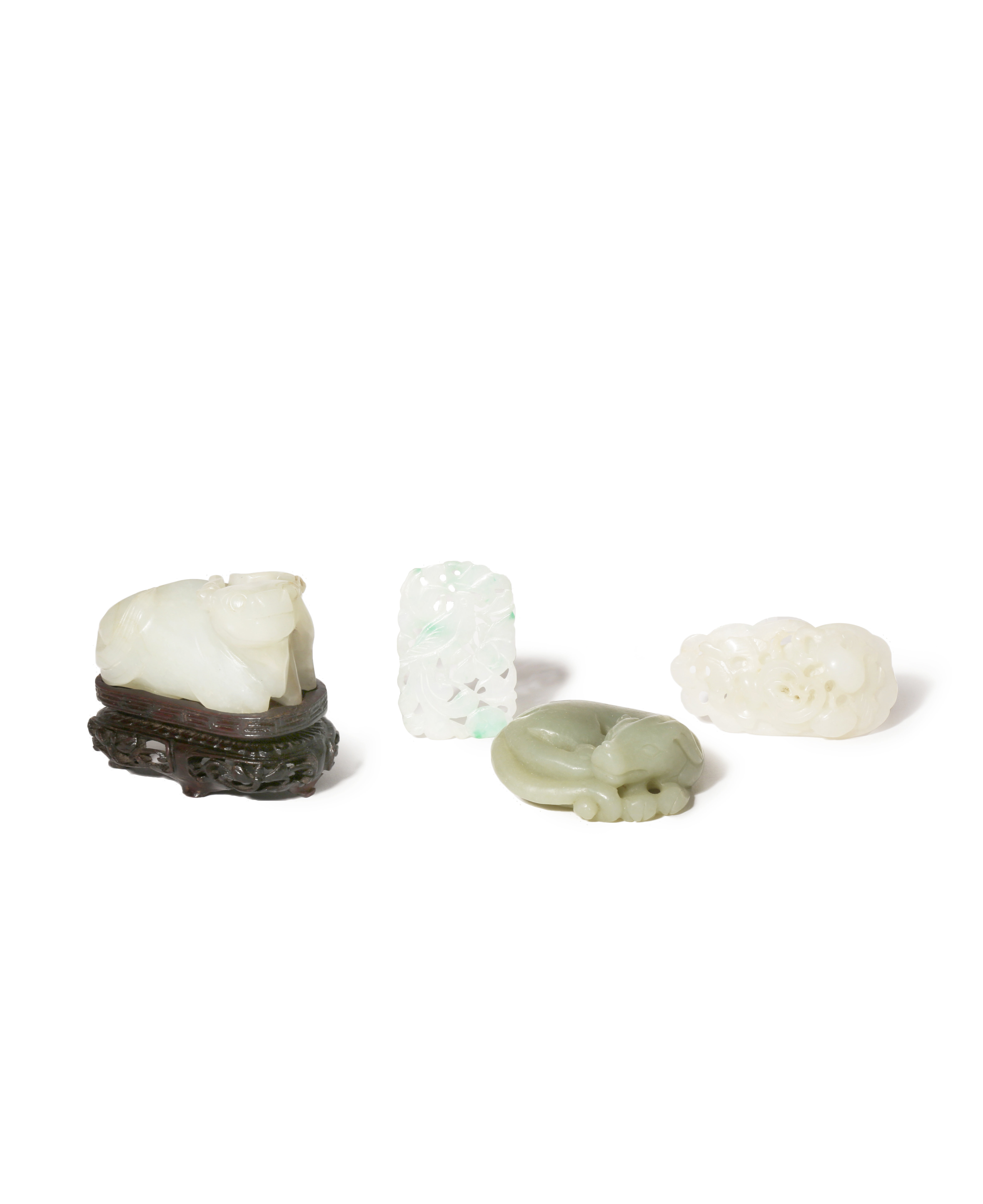 One a recumbent water buffalo together with an openwork wood stand, another formed as a reclining dog with its head resting upon its paws, one pendant of a pale celadon colour and carved as pierced fruits with the underside in the shape of a leaf, the other a green speckled jadeite pendant carved in openwork with a pheasant amongst leaves, 5.8cm. (5)
