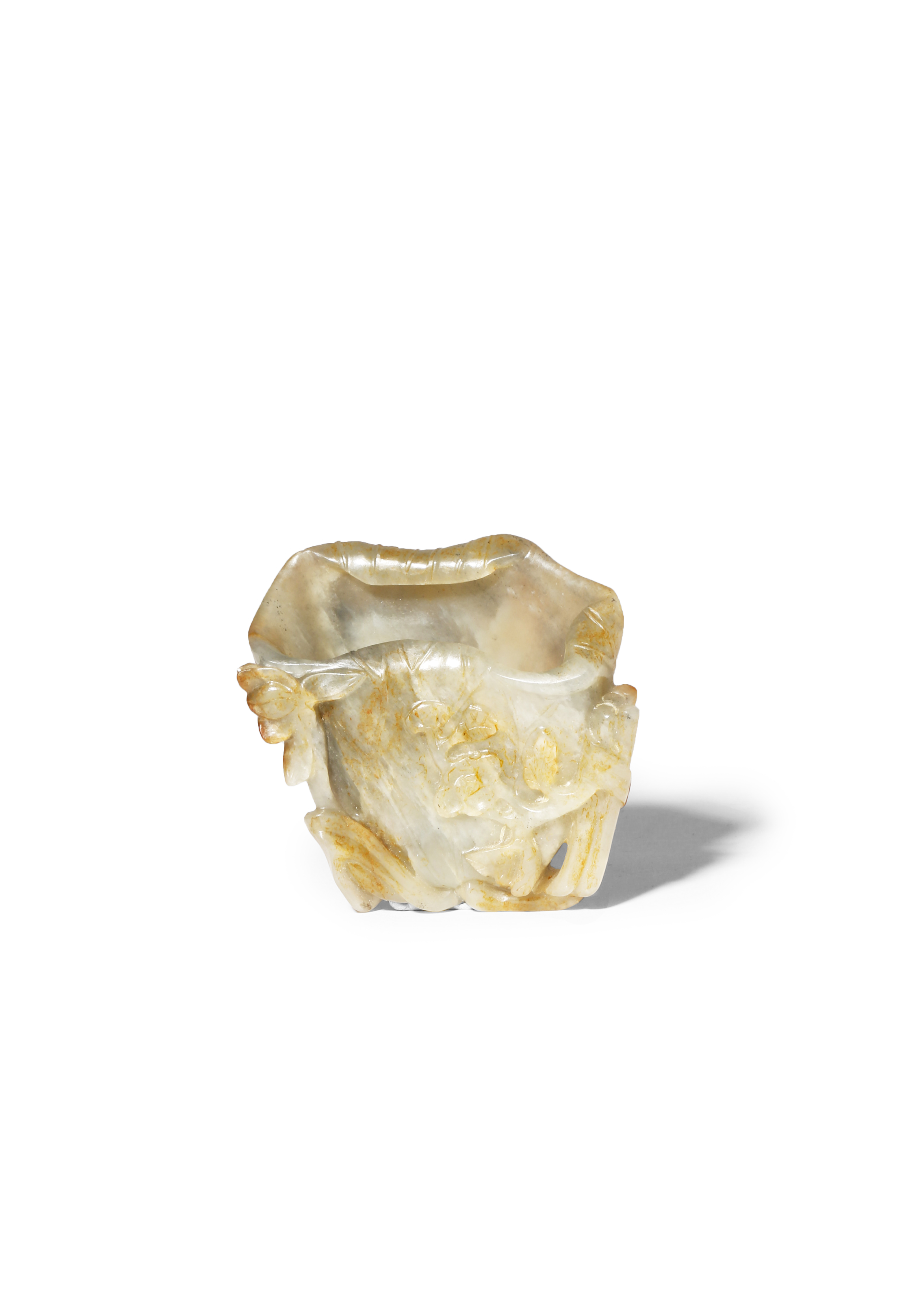 A SMALL CHINESE CELADON AND RUSSET JADE VASE FORMED AS A LOTUS LEAF MING DYNASTY Carved in relief...