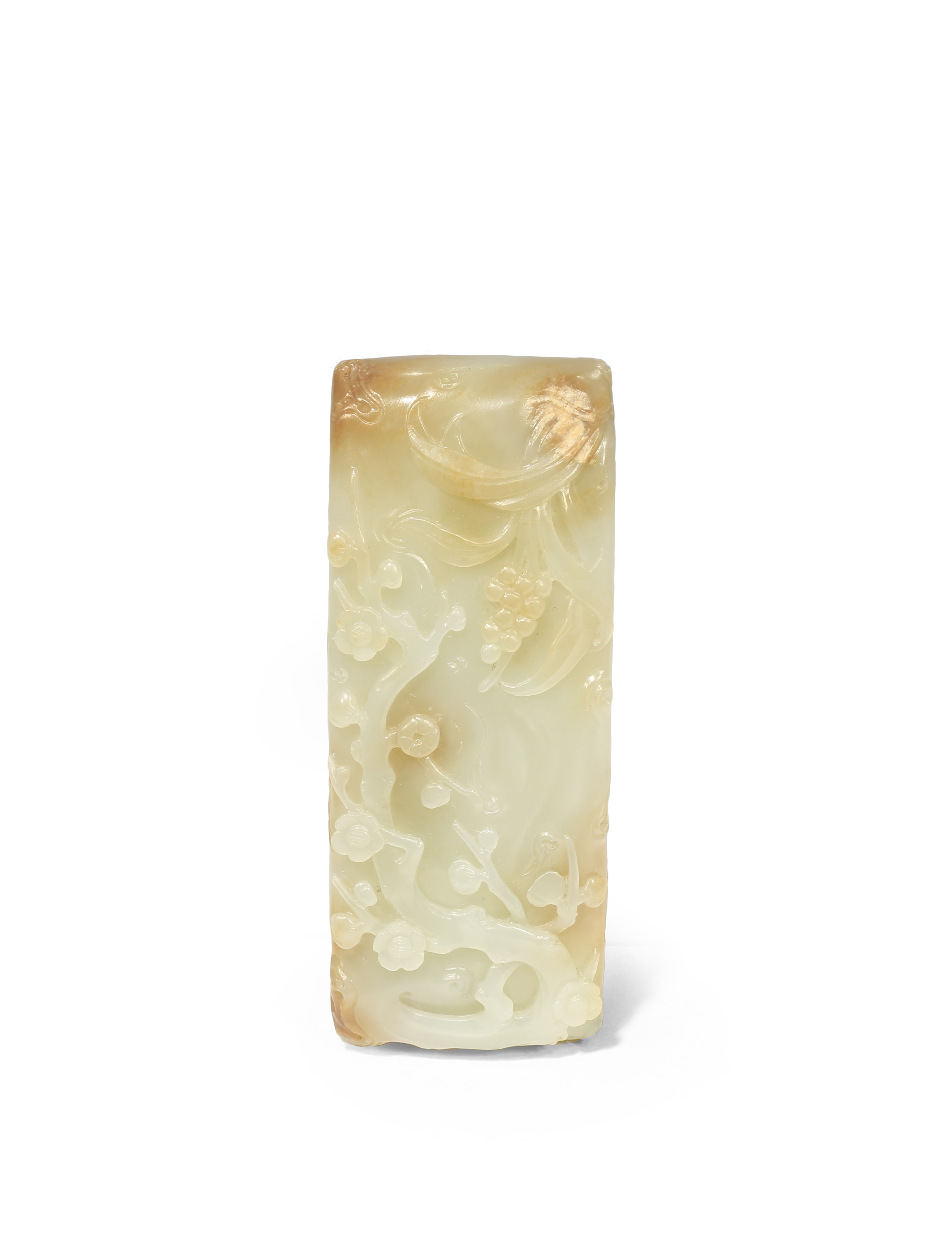 A CHINESE PALE CELADON JADE 'PRUNUS' BRUSH REST QING DYNASTY OR LATER Of rectangular form with...