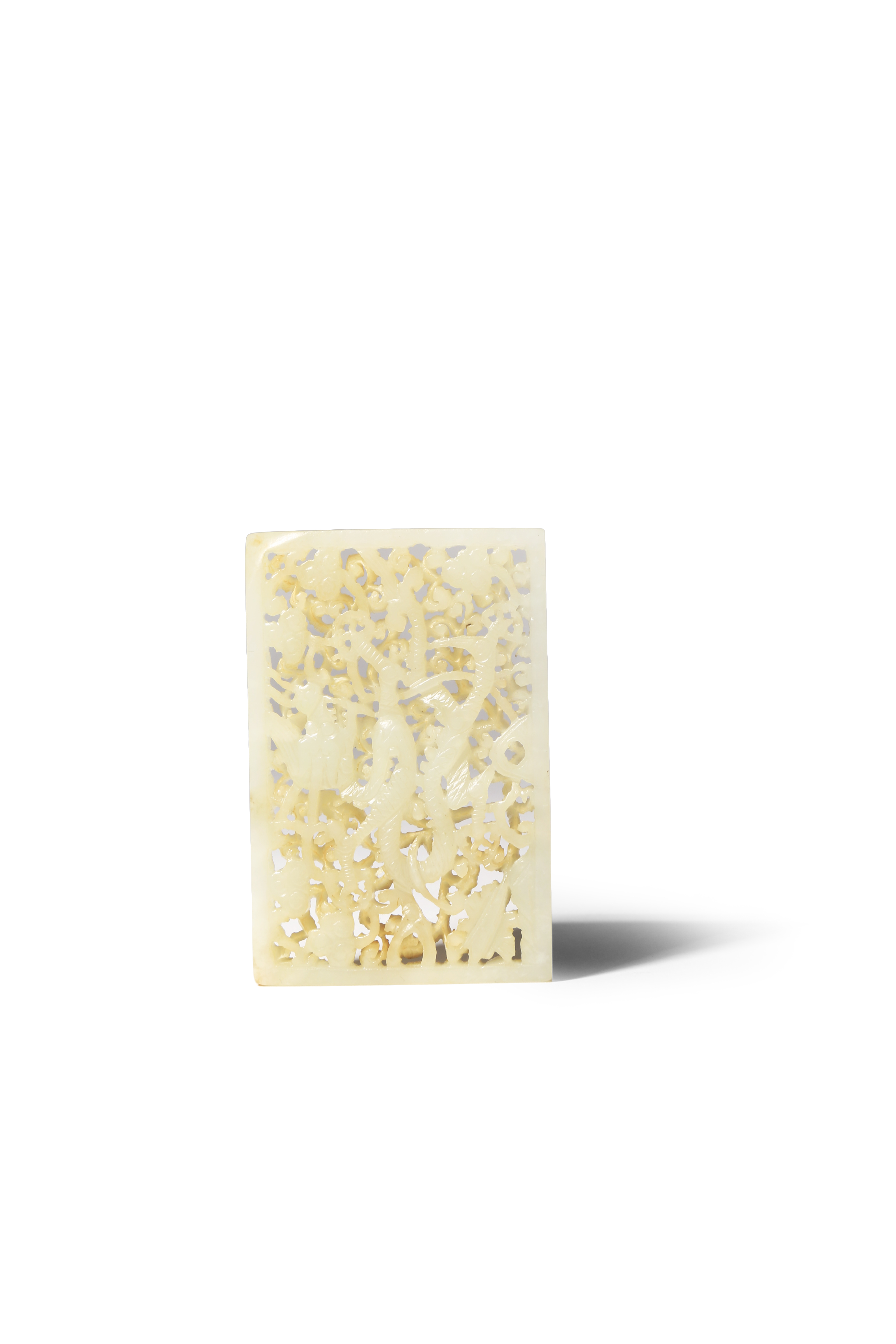 Carved in openwork with the fierce mythical beast amidst scrolling foliage and clouds, all contained within a solid plain border, the stone with some minor russet markings, 7.6cm.