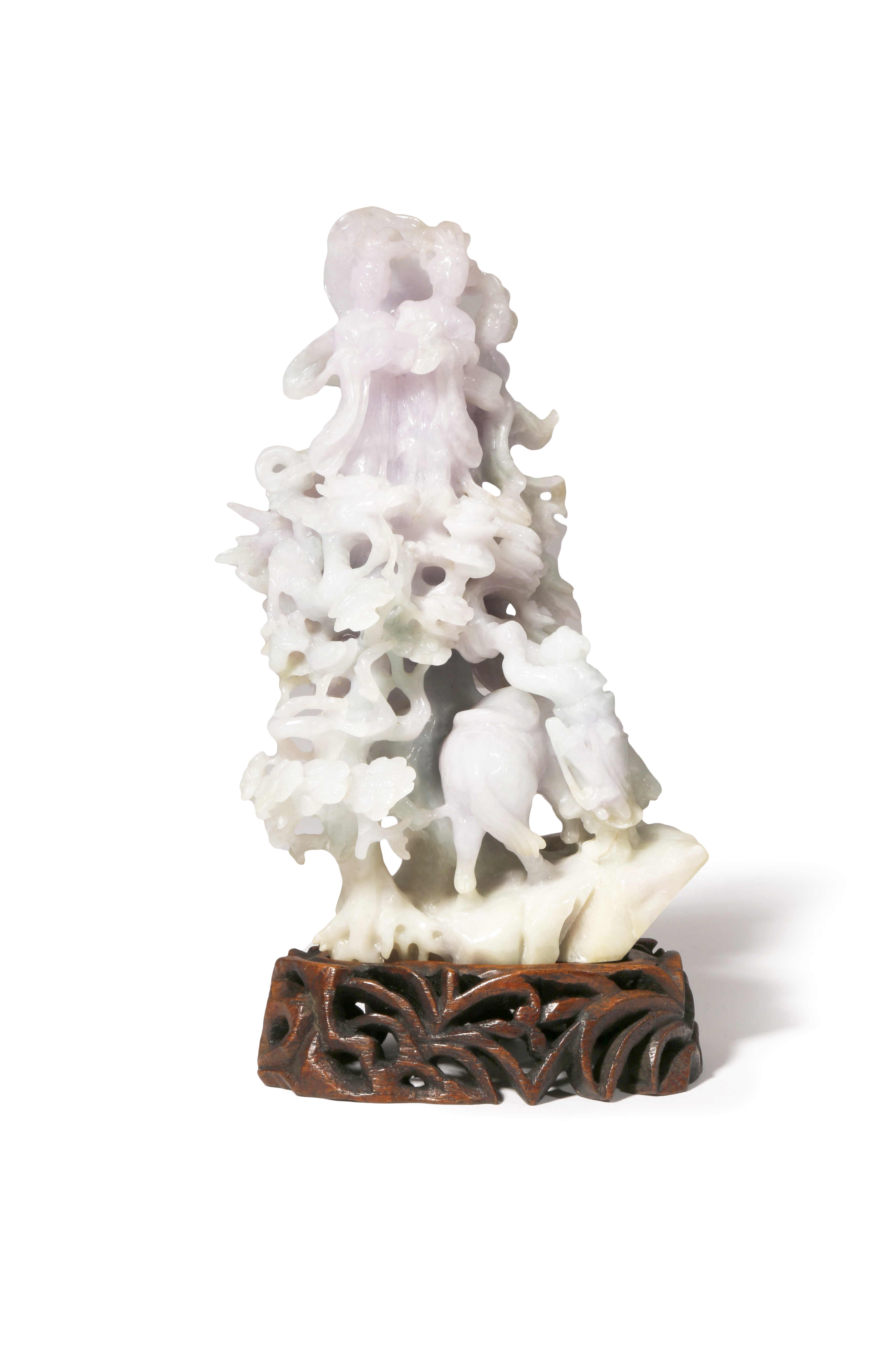 Depicting a group of Immortals with an attendant standing on clouds above a pine tree, a scaly dragon lurking at their feet, with a figure and a grazing horse at the base of the tree, the stone with pale lavender and green areas, together with a wood stand, 18cm. (2)