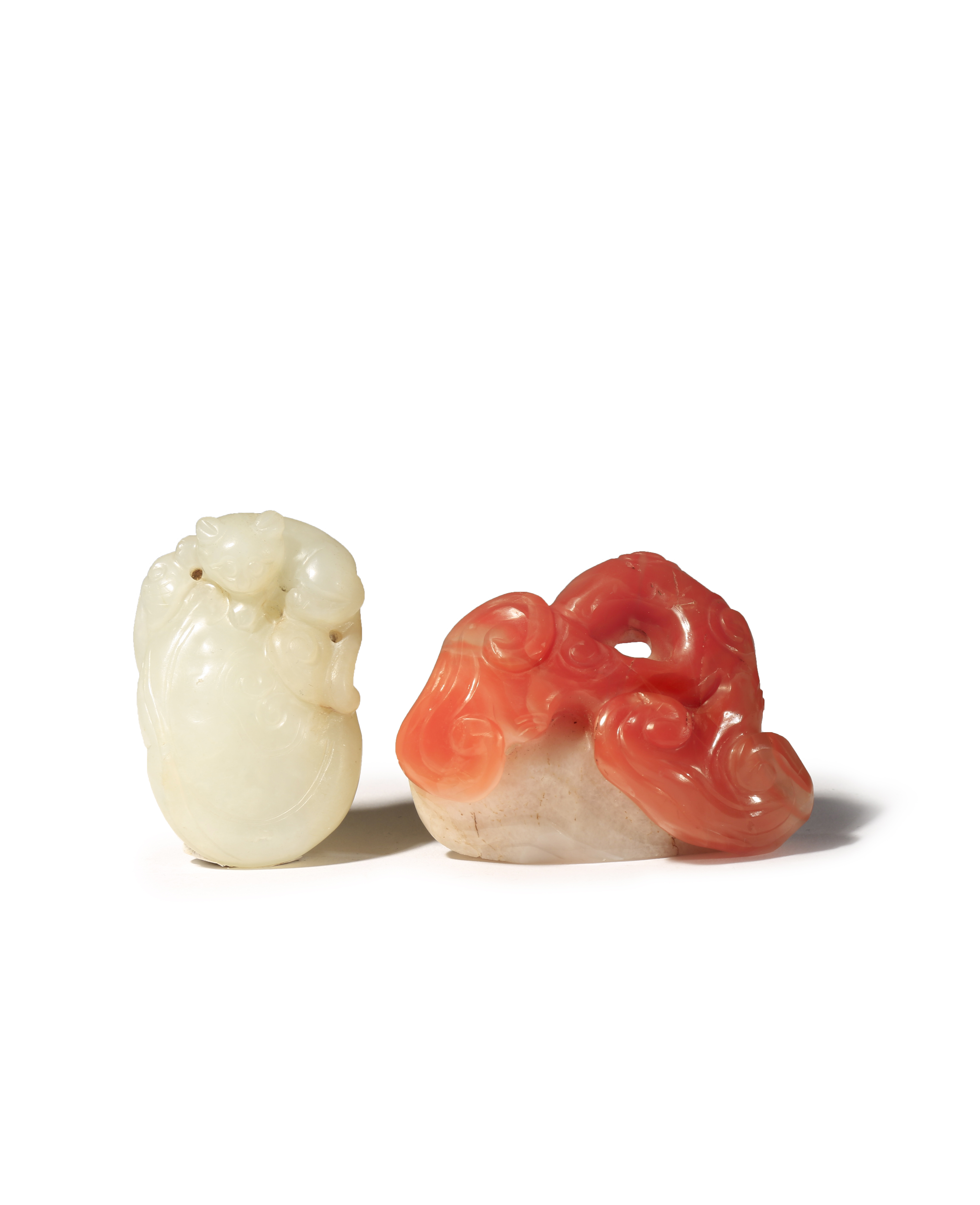 A CHINESE AGATE CARVING AND A JADE PENDANT