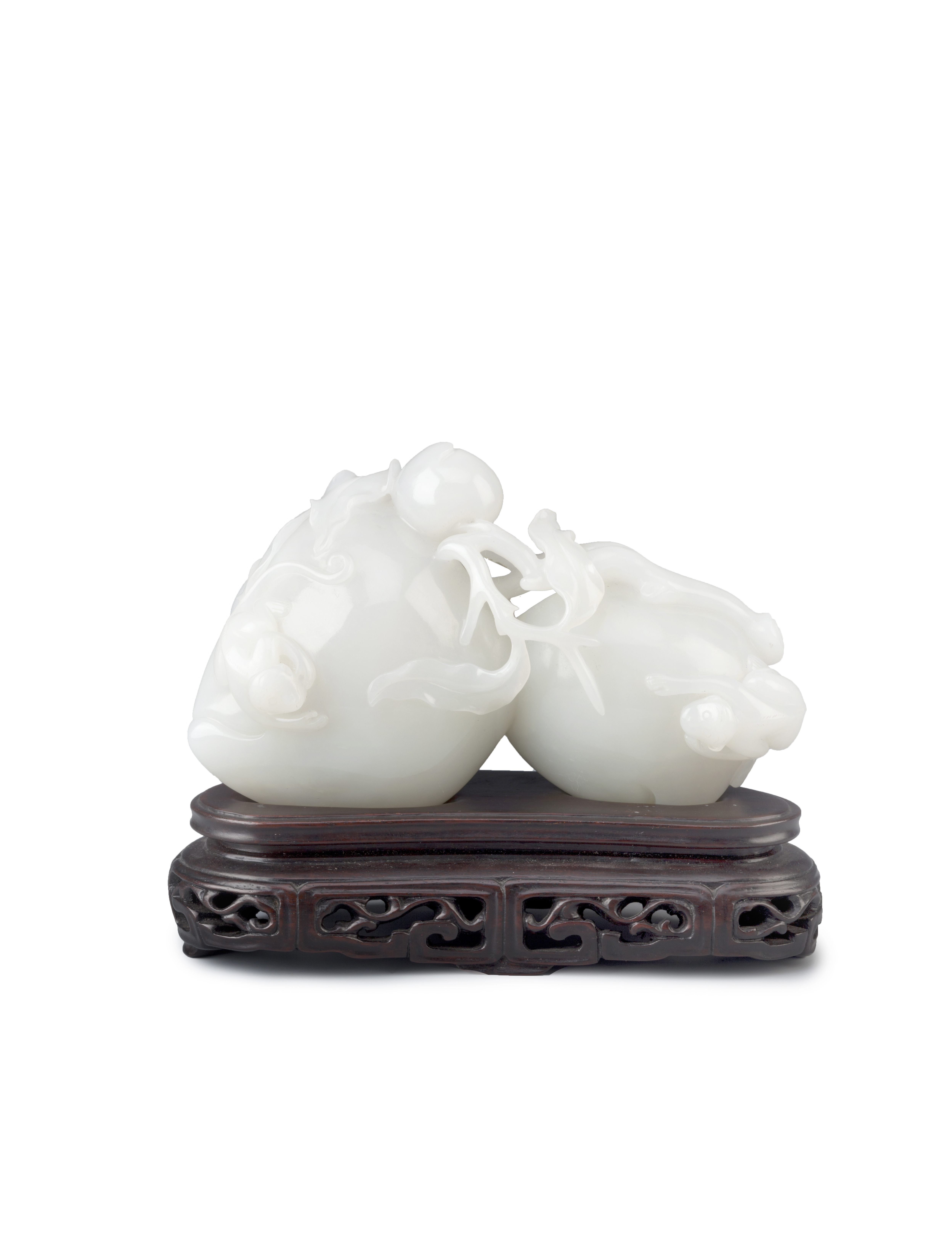 Depicting two large and three small peaches issuing from a branch, with two monkeys climbing the larger fruits, the surface highly polished, together with a wood stand, 13cm. (2)