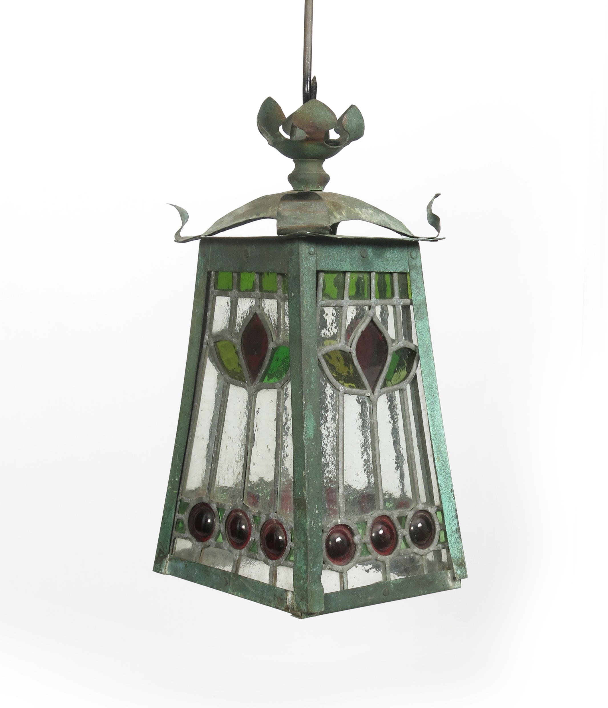 A leaded glass hall lantern, flaring verdi-gris copper frame with shallow domed top, the leaded glass panels with foliate motif in red and amber glass unsigned, 34cm. high