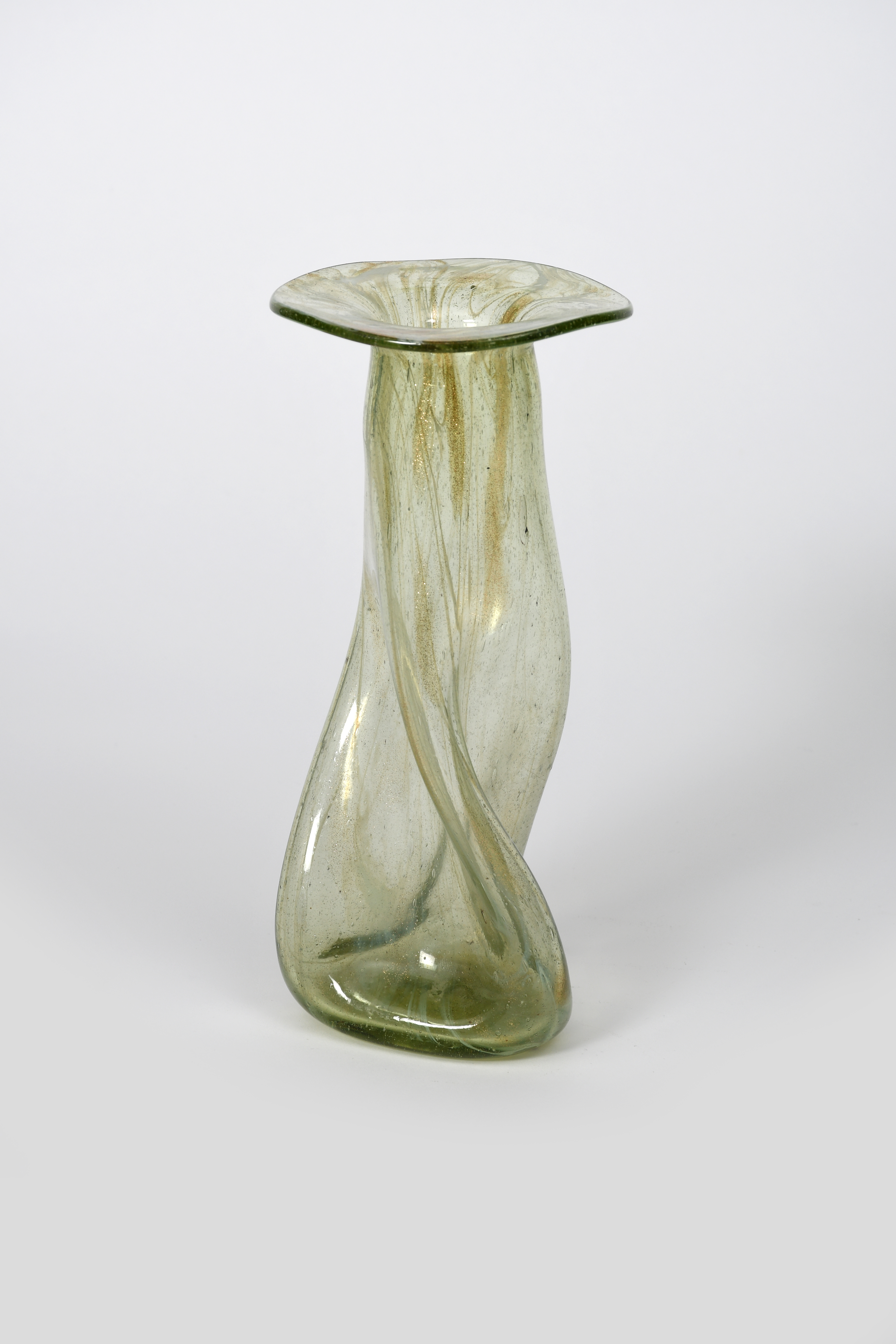 A James Couper and Sons Clutha glass Propeller vase designed by Dr Christopher Dresser, twisted form with everted flat top rim, pale green glass with aventuring inclusions and white swirls, unsigned, 23cm. high