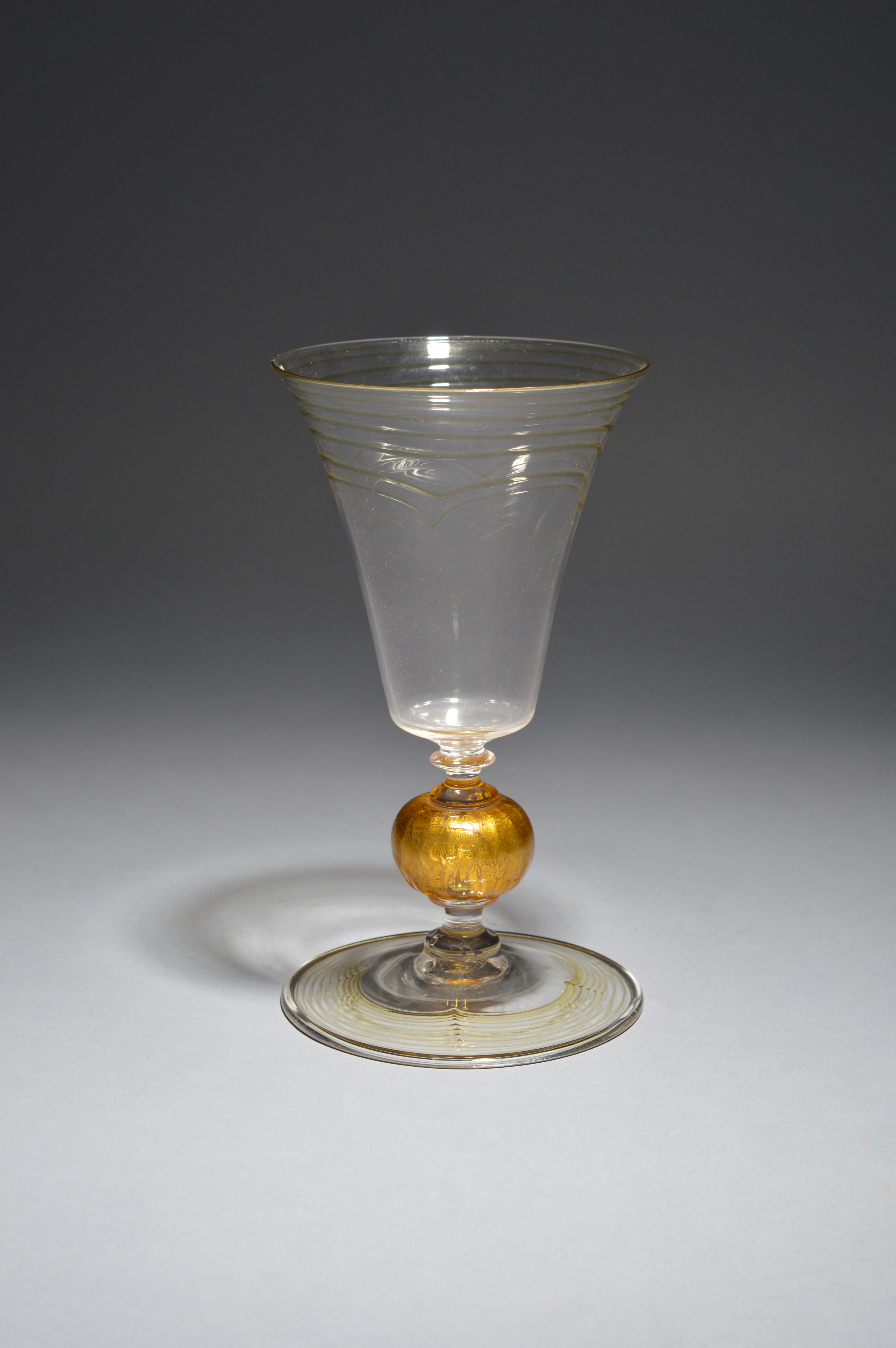Lesley Jackson Whitefriars Glass The Art of James Powell & Sons, Richard Dennis Publications, page 113 plate 76 for comparable goblets with embedded gold knops designed by Harry J Powell probably between 1905-1919.