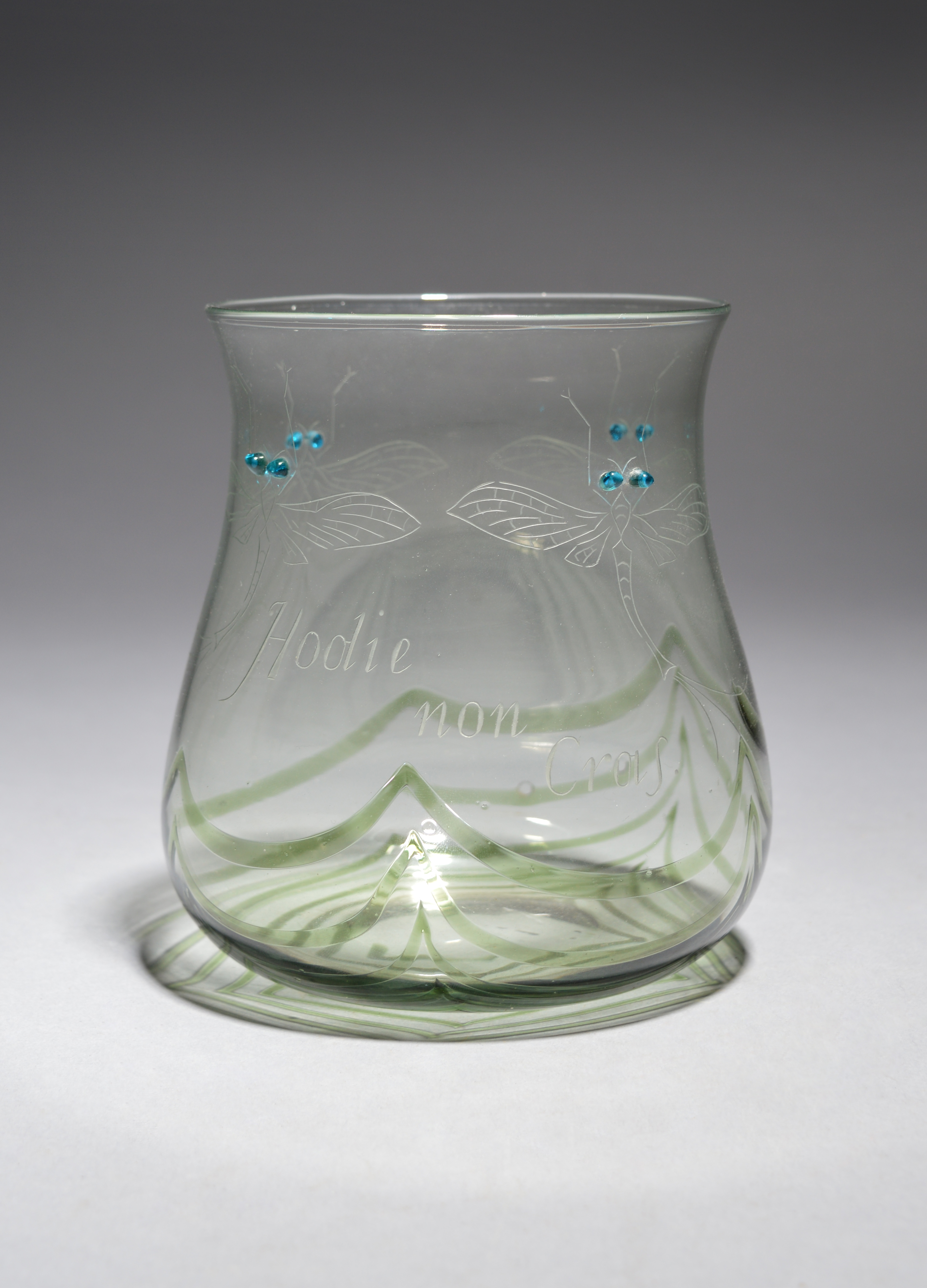 A rare James Powell and Sons Whitefriars Sea Green glass vase designed by Harry J. Powell, with pulled dark green melted threads, engraved with dragonflies, with applied blue glass eyes, engraved inscription Hodie non Cras, (today tomorrow), unsigned, 13cm. high