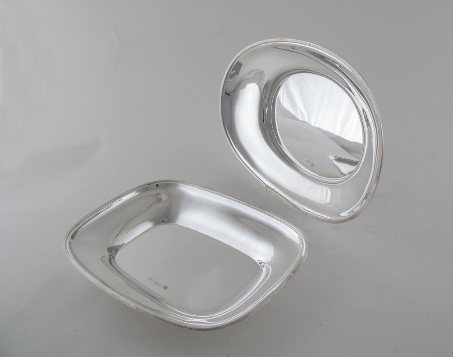 An oval bread dish, reeded rim and another rounded oblong example, by Barker Ellis, Birmingham 1997, the former 11.8in (30cm), 32oz. (2)