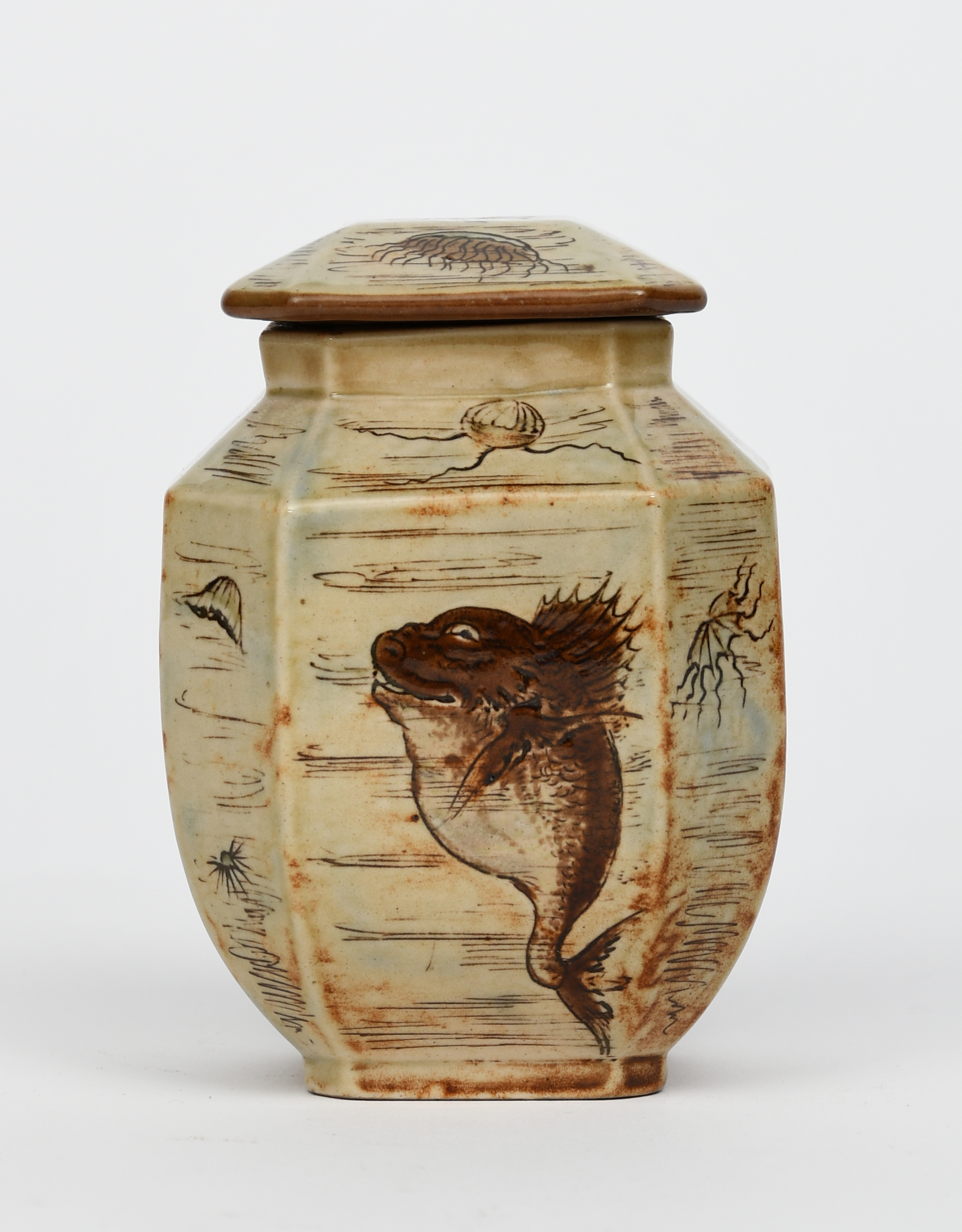 A fine Martin Brothers stoneware Aquatic tea caddy and cover by Edwin and Walter Martin, dated 1900, canted square section, incised with scaly fish to each side with jelly fish to the canted corners, shoulder and cover, in shades of brown and pale blue on a buff ground, highlighted with white, incised 3-1900 Martin Bros London & Southall to cover and base, Richard Dennis Exhibition paper label, 11cm. high, (2)