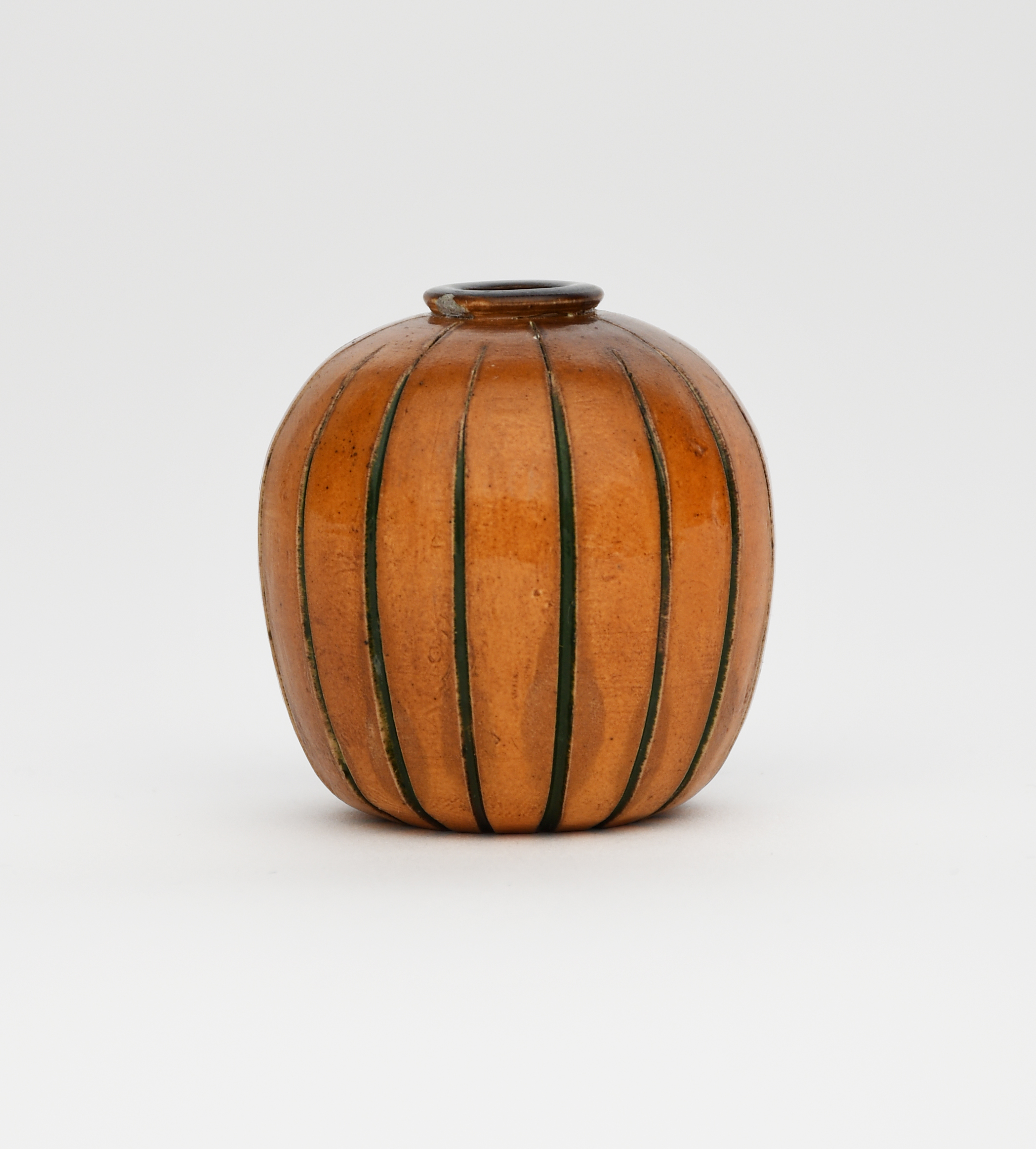 A Martin Brothers stoneware miniature gourd vase by Edwin and Walter Martin, ovoid with incised vertical ribs, tan glazed with painted green rib highlights, 6-1916 Martin Bros London & Southall, small glaze nick to outside of top rim, 4.5cm. high