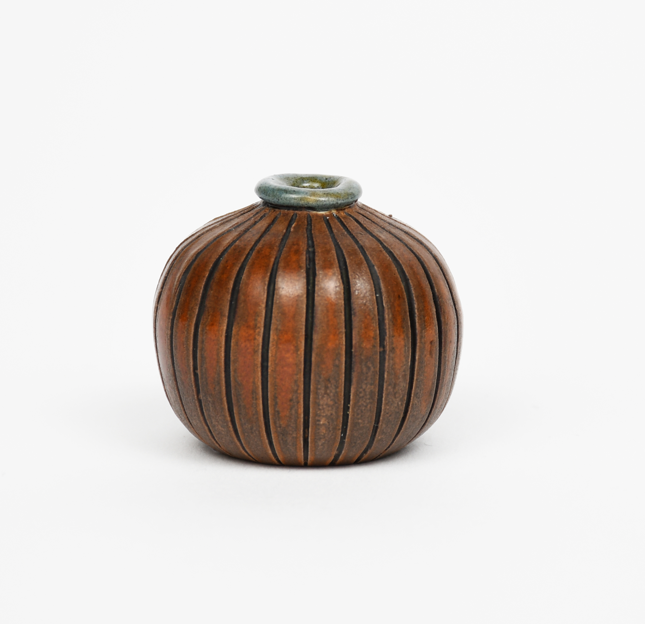 A Martin Brothers stoneware miniature gourd vase by Edwin and Walter Martin, dated 1902, ovoid modelled as an urchin, glazed in ochre incised 11-1902 Martin Bros London, 3.5cm. high