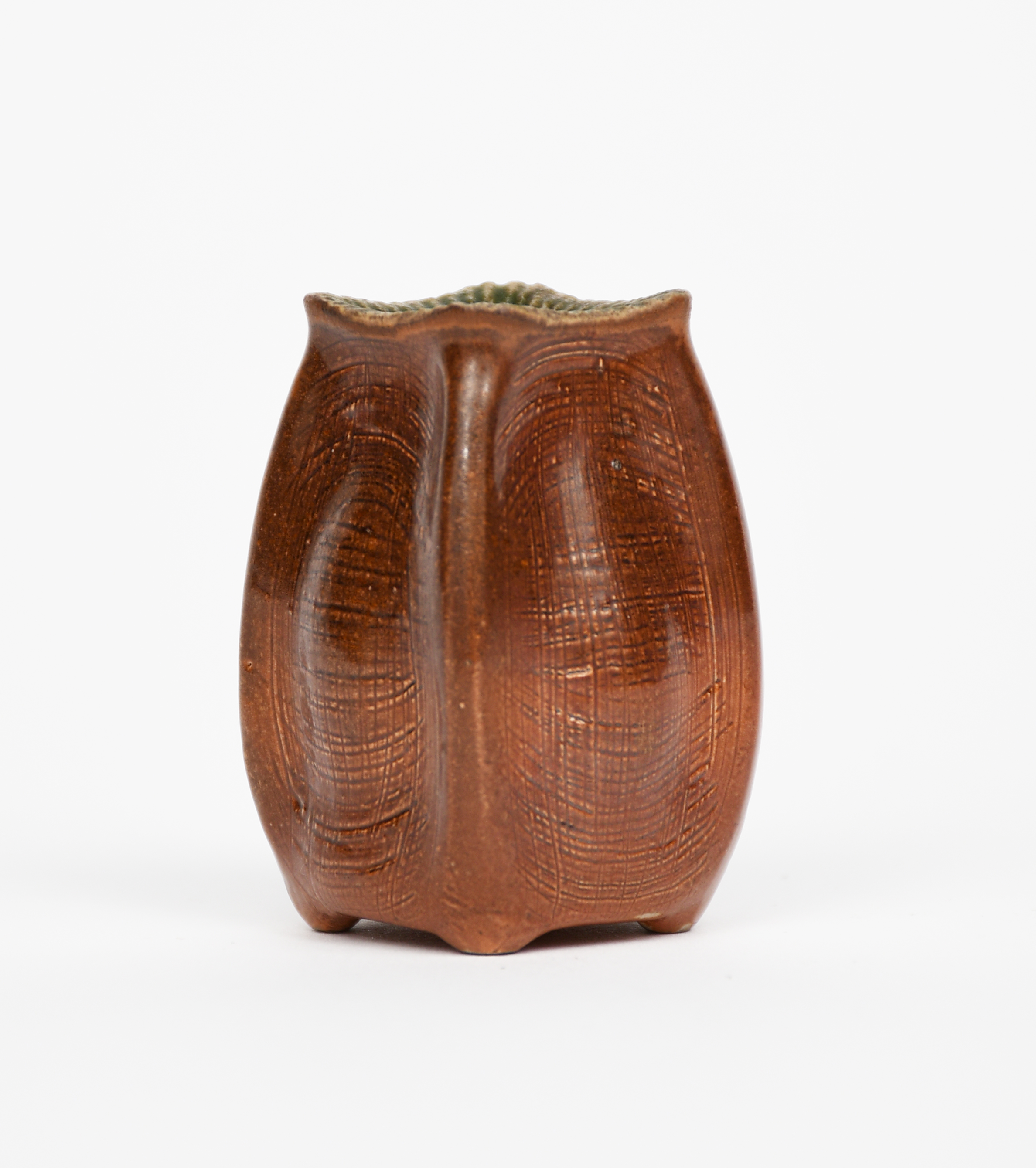 A Martin Brothers stoneware miniature gourd vase by Edwin and Walter Martin, 1902, swollen square section incised with fine horizontal ribbing glazed brown, the collar rim with incised decoration highlighted in green, incised 11-1902 Martin Bros London 5cm. high