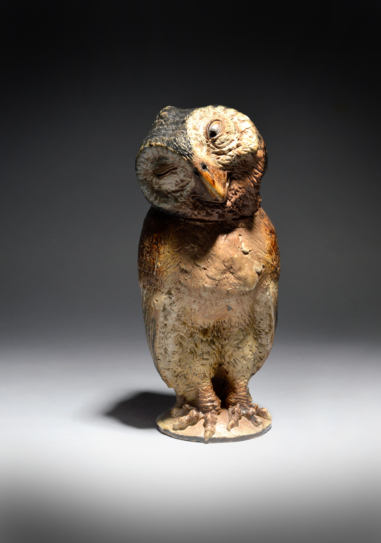 The Wise Owl a fine Martin Brothers stoneware bird jar and cover by Robert Wallace Martin, dated 1884, modelled with claw feet, resting, his round head tilted to one side, one eye remaining vigilantly open, glazed in brown, ochre and buff, incised R W Martin Sc, London 11 1884 to base and c R W Martin & Brothers London & Southall 11 1884 to cover, repaired damages, 29.5cm. high