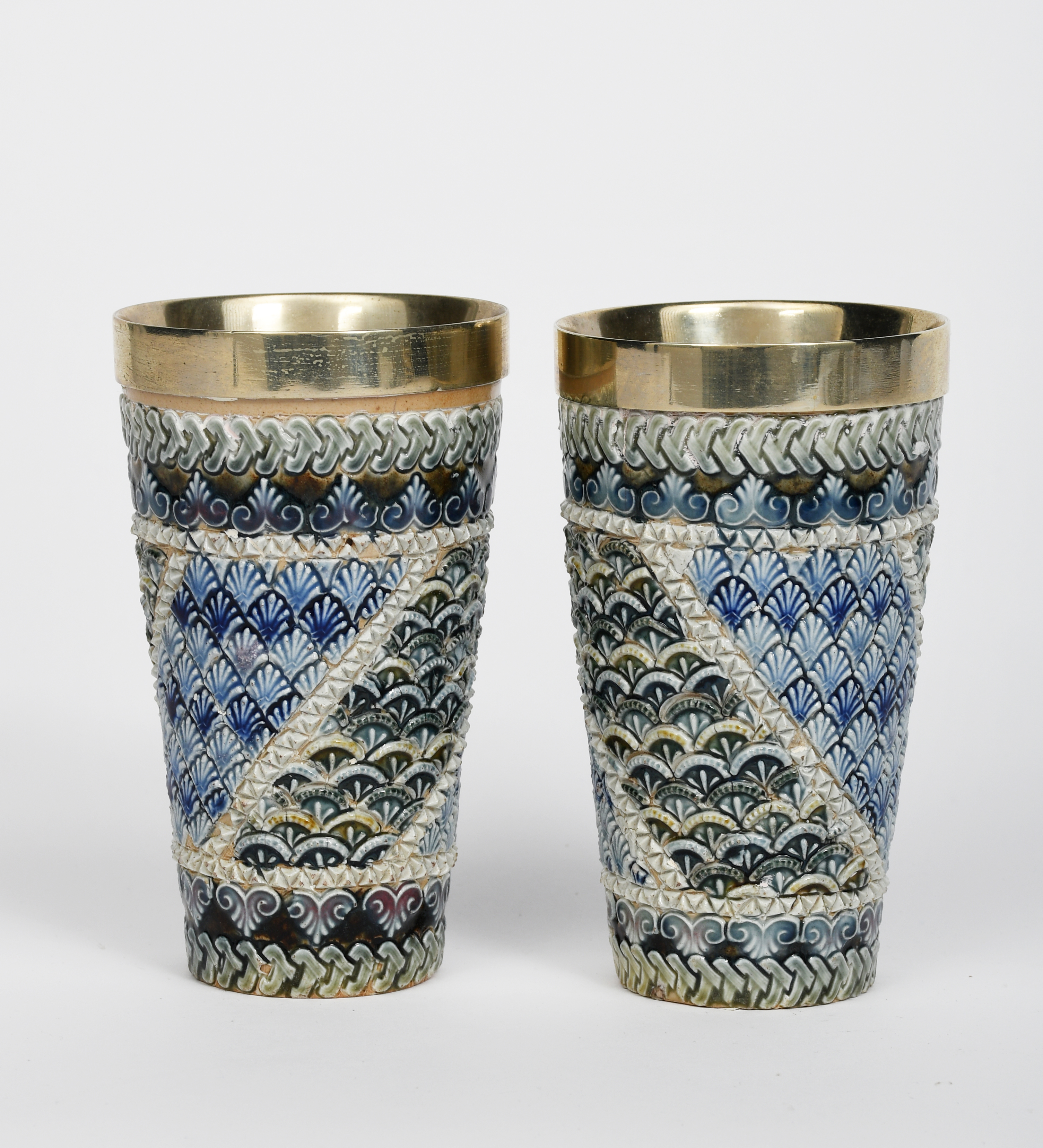 A pair of Doulton Lambeth stoneware beakers, dated 1880, flaring conical form with incised panel decoration glazed blue and green, with metal mounts, impressed marks, hairline to one beaker, 14.5cm. high, (2)