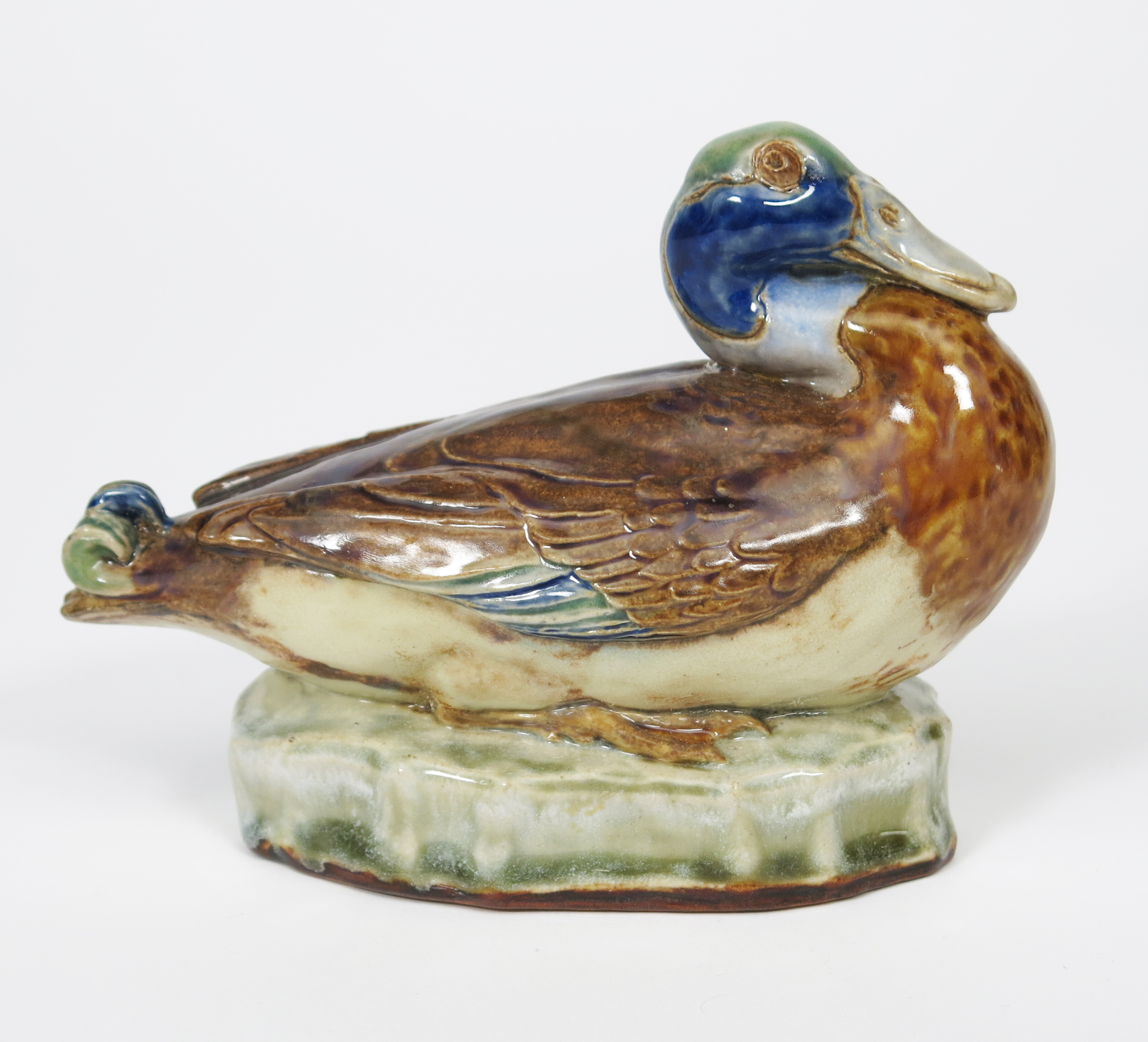 A Royal Doulton stoneware model of a duck designed by Harry Simeon, model no 539, resting on an oval base, painted in colours impressed factory marks, incised HS monogram, professional restoration, 17cm. wide.