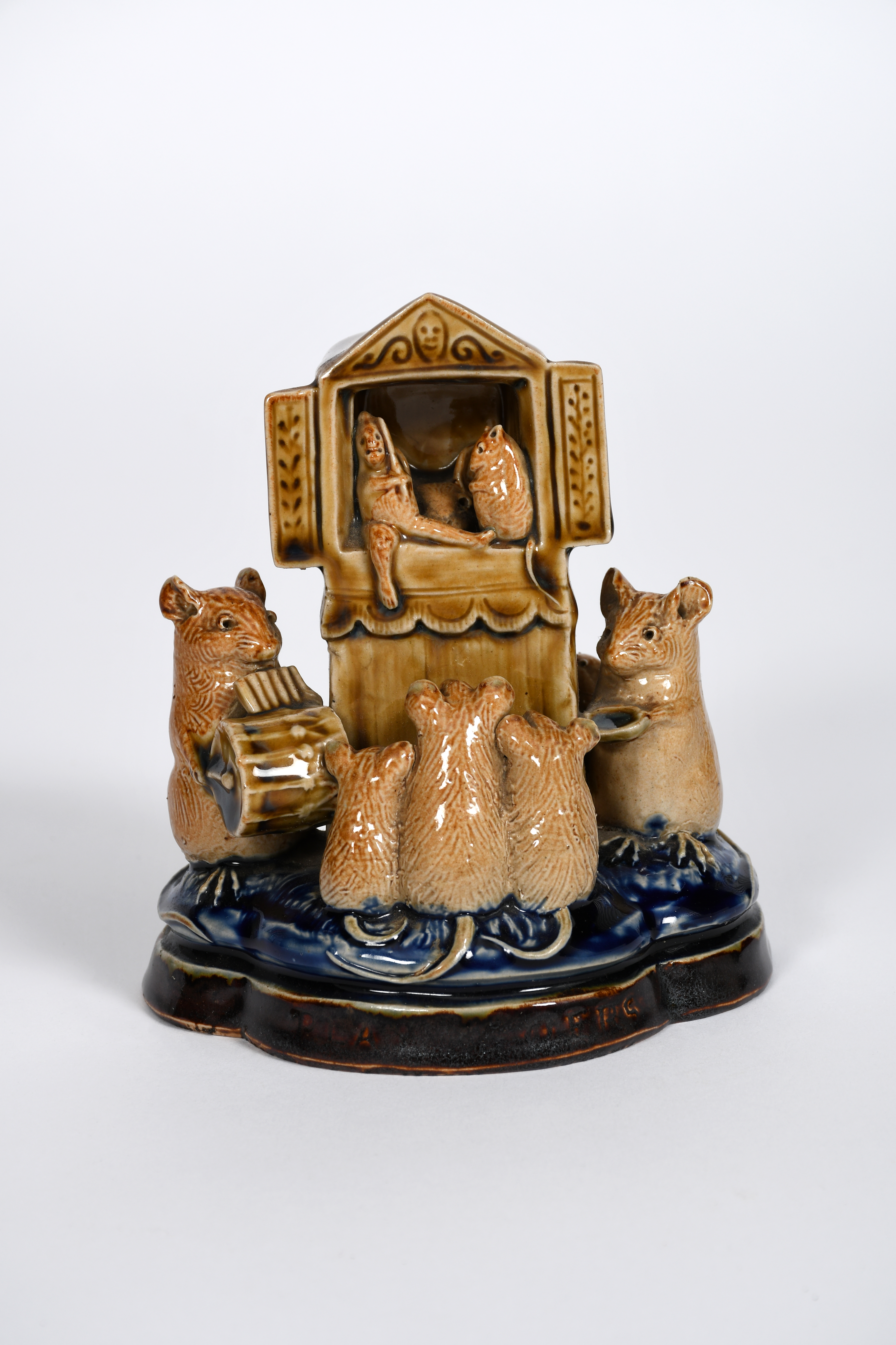 Play Goers a rare Doulton Lambeth stoneware Mouse Musician group by George Tinworth, modelled as a punch and judy show in a tent, being orchestrated by a mouse, a family of three mice watch, the tent flanked by a mouse playing a base drum and pan pipes, another holds out a dish, around the back a young mouse peeks into the tent, in shades of blue ochre and brown, incised Play Goers to base rim, impressed Doulton Lambeth mark dated 1881, GT monogram, minor chips to ears 12.5cm. high