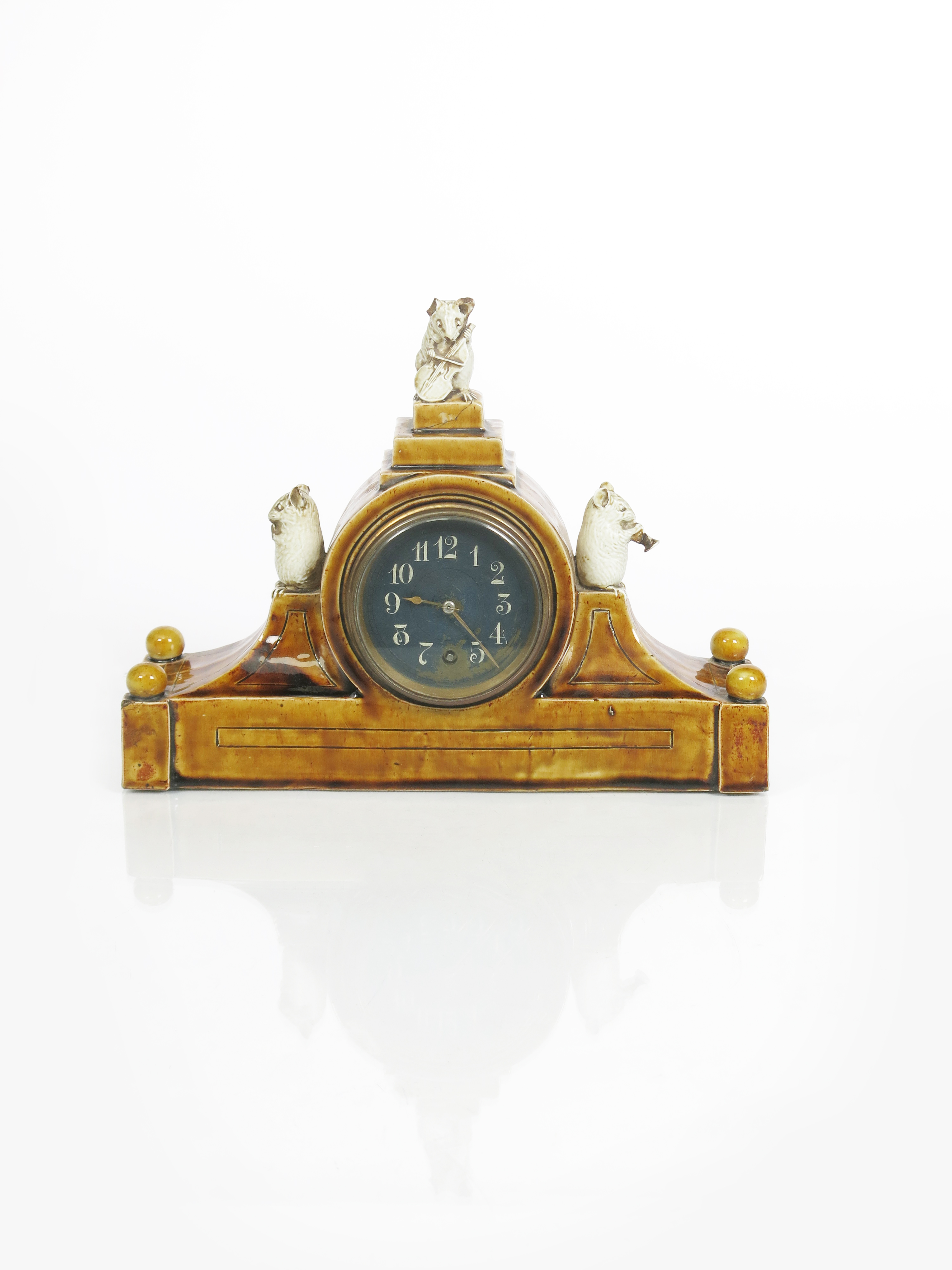 A rare Royal Doulton stoneware Mouse Musician clock by George Tinworth, tapering rectangular section supporting circular case with dial, surmounted with a mouse playing the cello, flanked by mice playing a trumpet, glazed in shades of ochre, the circular dial with Arabic numerals, impressed factory marks to back, repaired damages, 32cm. wide.