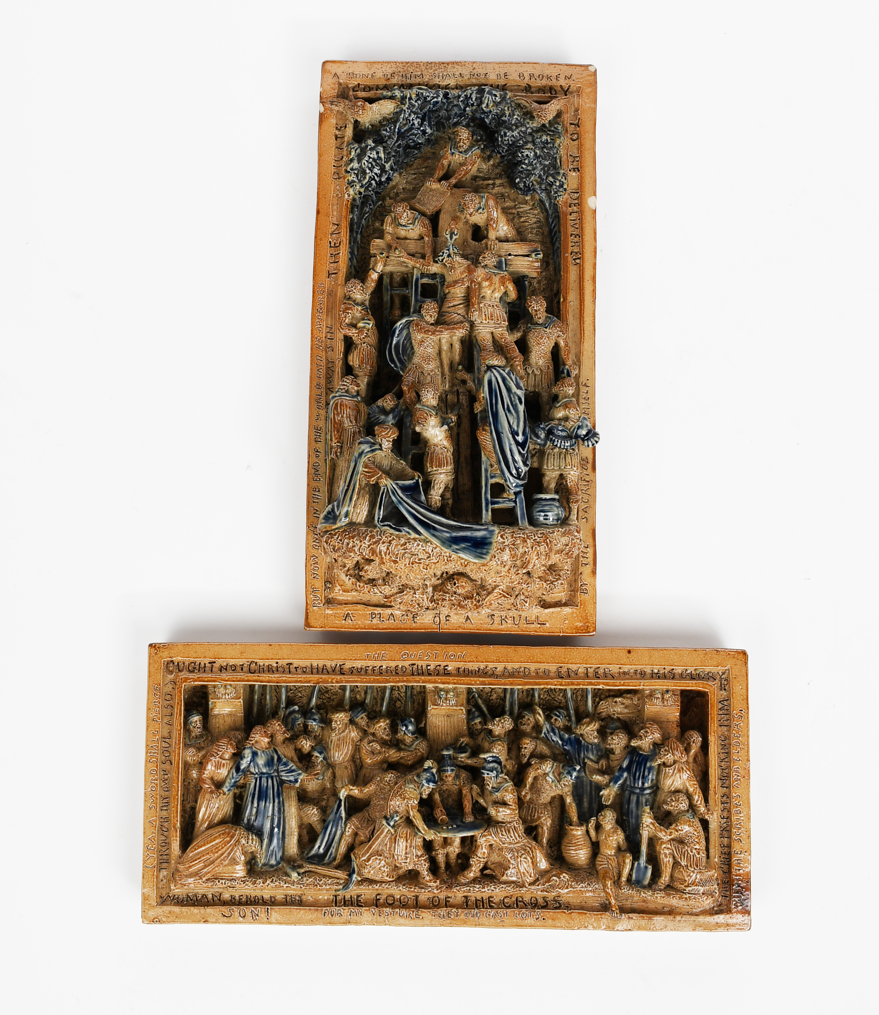 A Place of a Skull and The Foot of the Cross two early Doulton Lambeth stoneware plaques by George Tinworth, modelled in relief, glazed blue and ochre, incised to the borders, incised marks and GT monogram, flat chips to rim of skull panel, 31 x 15cm. (2)