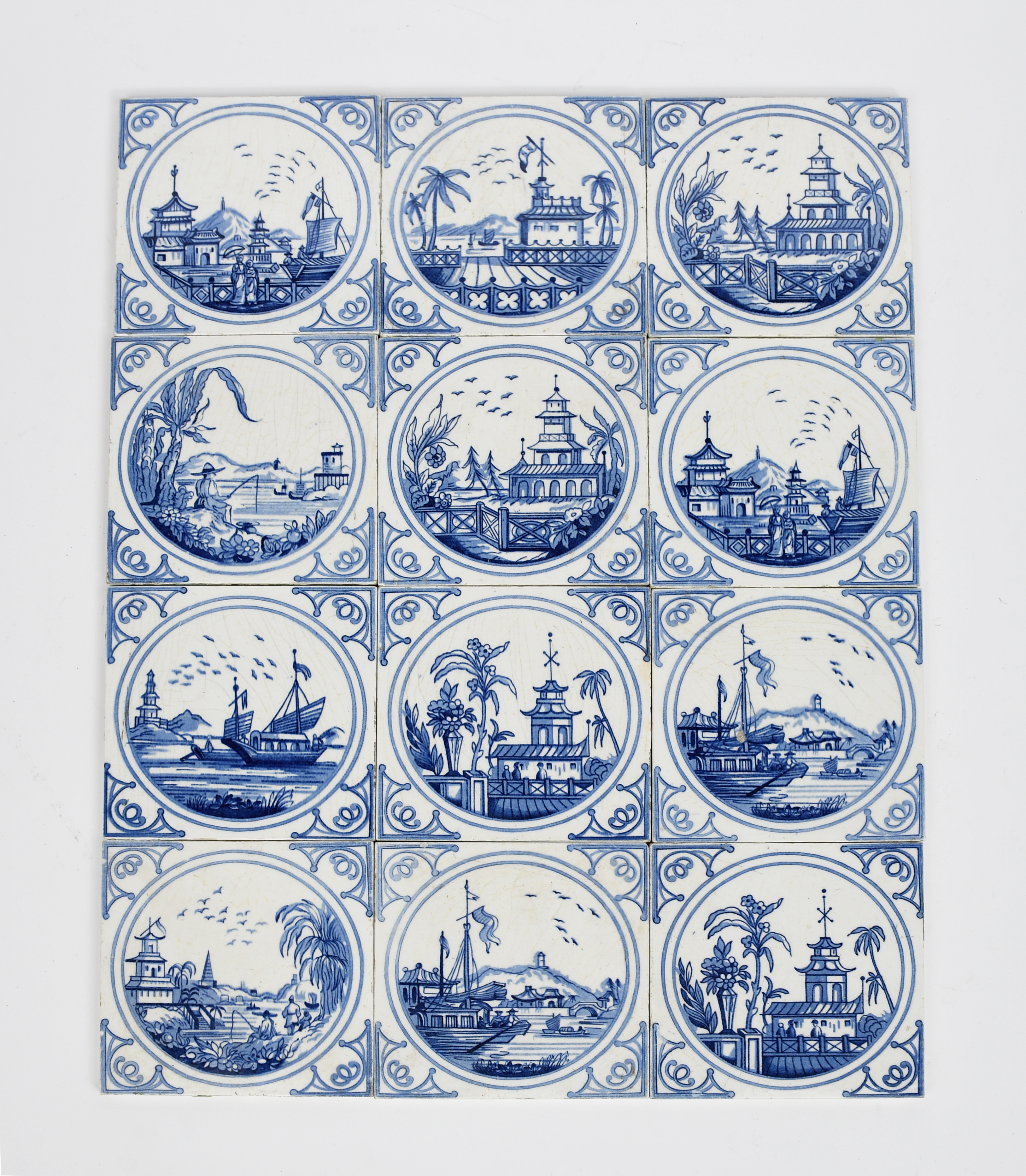 A set of twelve Minton and Hollins tiles, printed in blue on a white ground with idealised Chinese landscape scenes, including pagodas, fishermen and ships, the roundels inside a simple scroll corner, impressed marks, 15.5cm. square, (12)