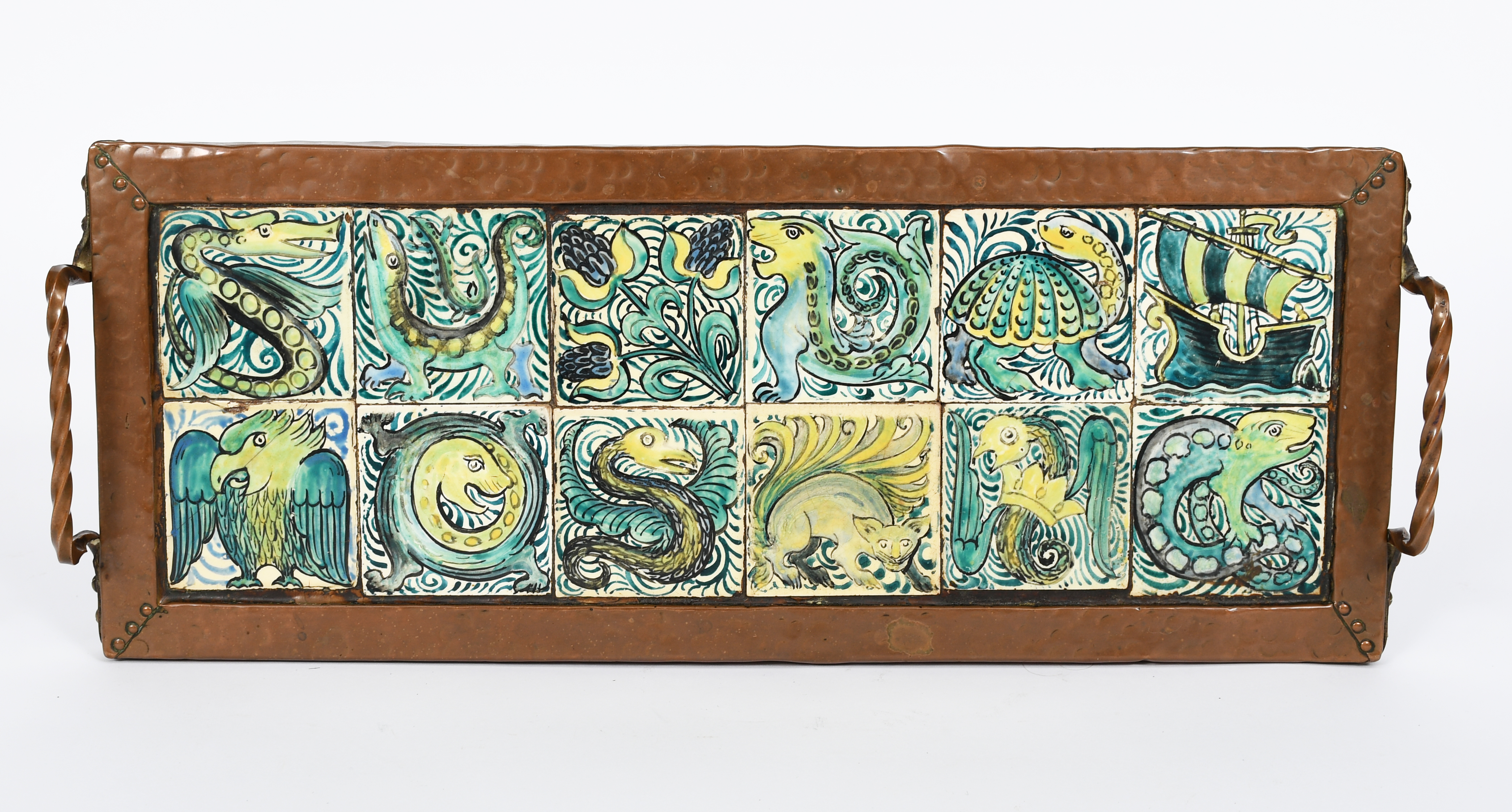A John Pearson copper and tile twin-handled tray, rectangular form, the tray set with twelve square tiles, painted with grotesque birds, animals, flowers and a galleon, painted in shades of blue, green and yellow, unsigned, three tiles cracked, 52cm. wide