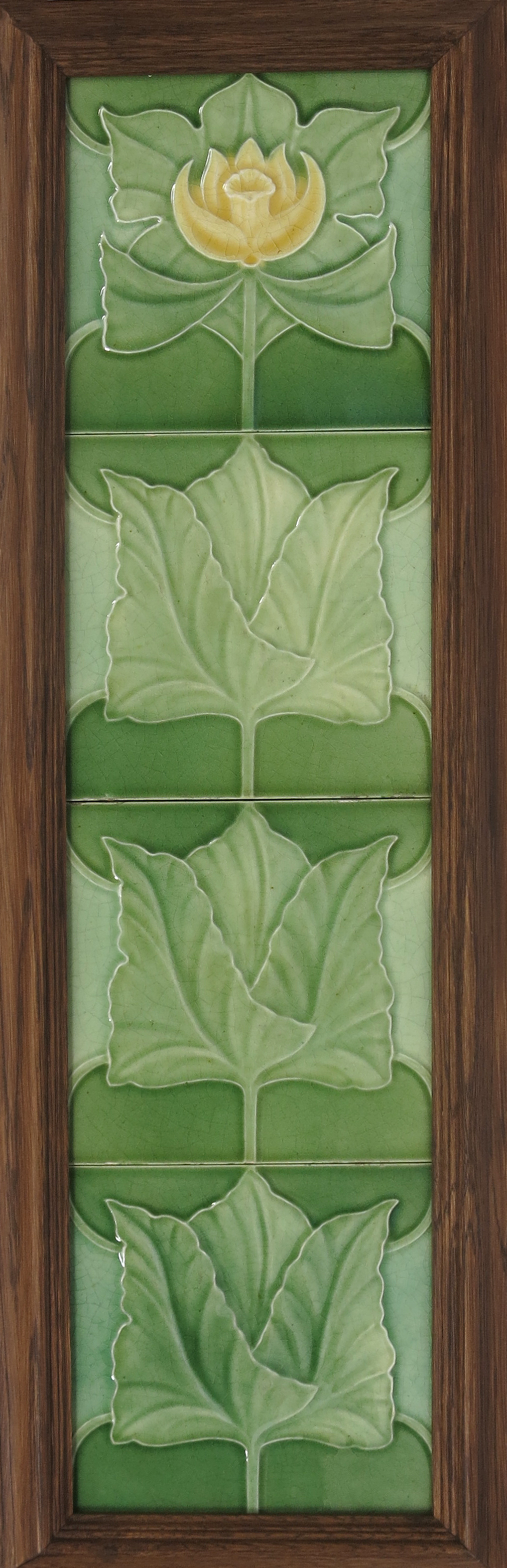 A J.C. Edwards four tile panel designed by C.F.A. Voysey, dust-pressed in low relief with a simple flowering stem, in shades of pale yellow and green, framed impressed marks, tiles 15cm square, 66 x 21cm (framed panel)