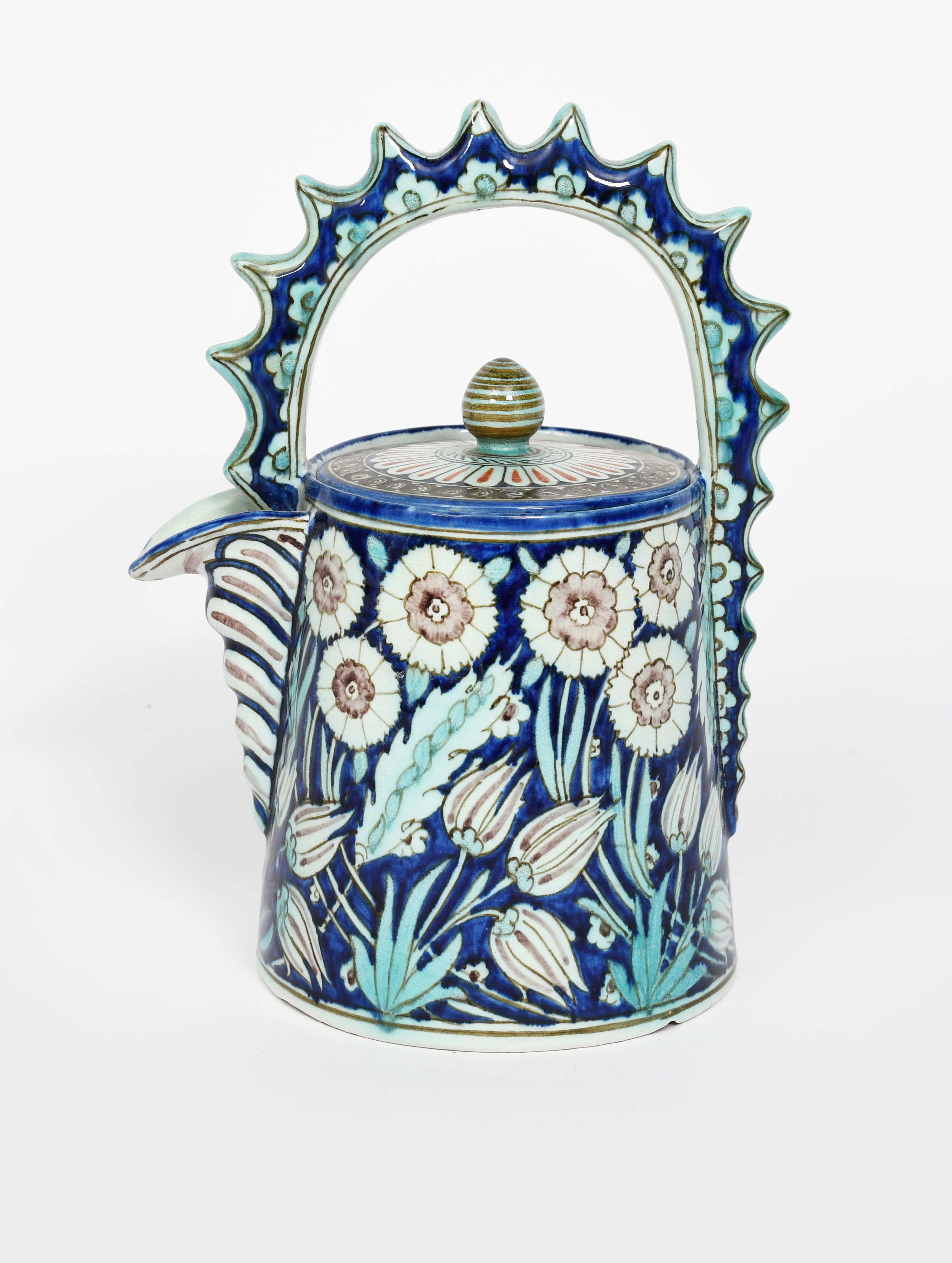 A Cantagalli Pottery Persian pot and cover, tapering cylindrical form with arched spiked handle, painted with carnation and tulip flowers in shades of blue, turquoise and aubergine on a white ground, painted mark to base, flat chip to base rim, 21cm. high
