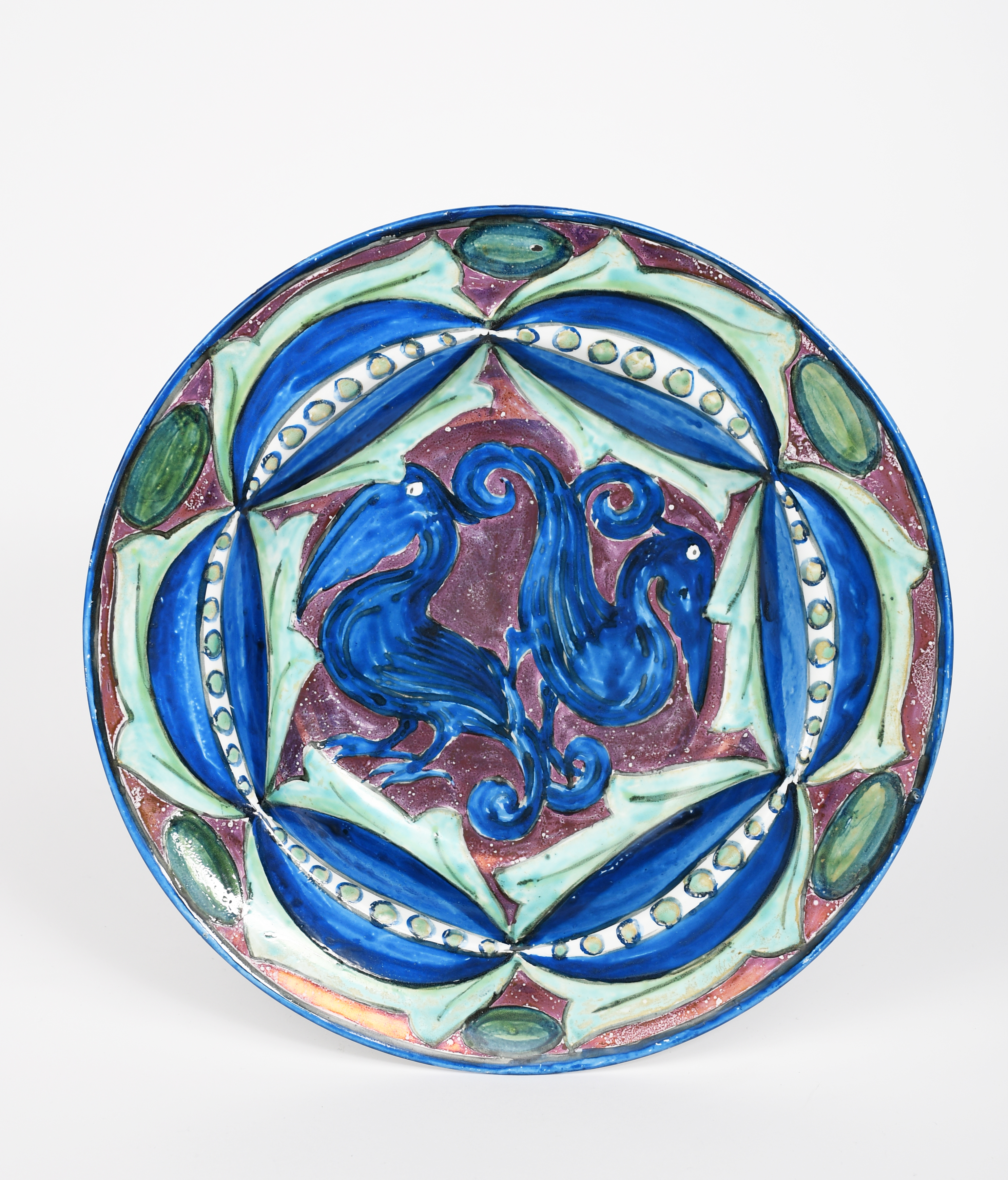 A John Pearson ceramic plate, painted to the well with two grotesque pelican birds, the rim a border of slender, stretched pomegranates, in shades of blue, green and purple lustre, the reverse with a lizard amongst scrolling foliage, painted JP monogram, 26.5cm. diam.
