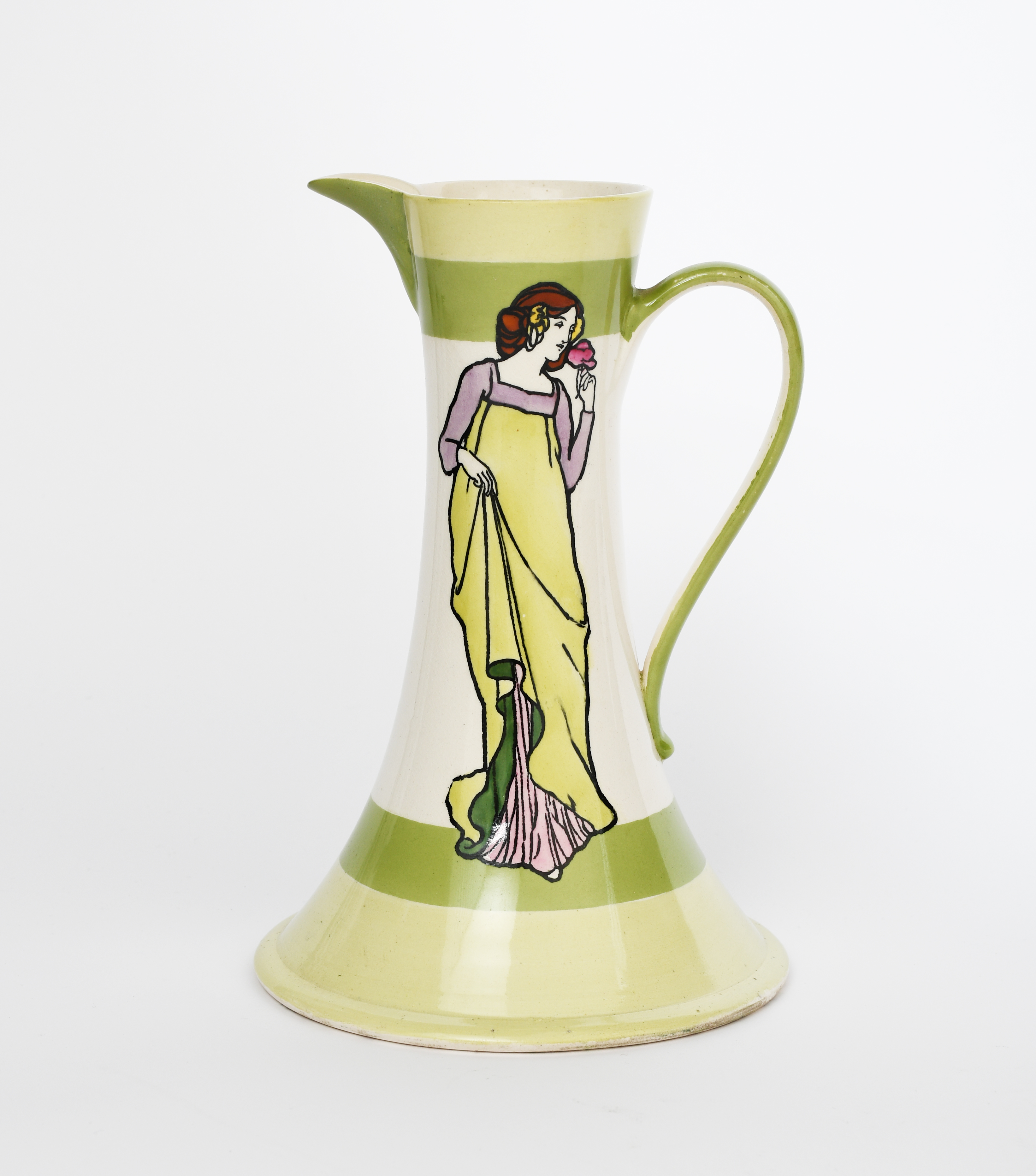 A Spencer Edge pottery ewer, tapering cylindrical form, printed and painted with an Art Nouveau maiden holding a rose, in colours on a white ground between green bands, printed factory mark, 25cm. high