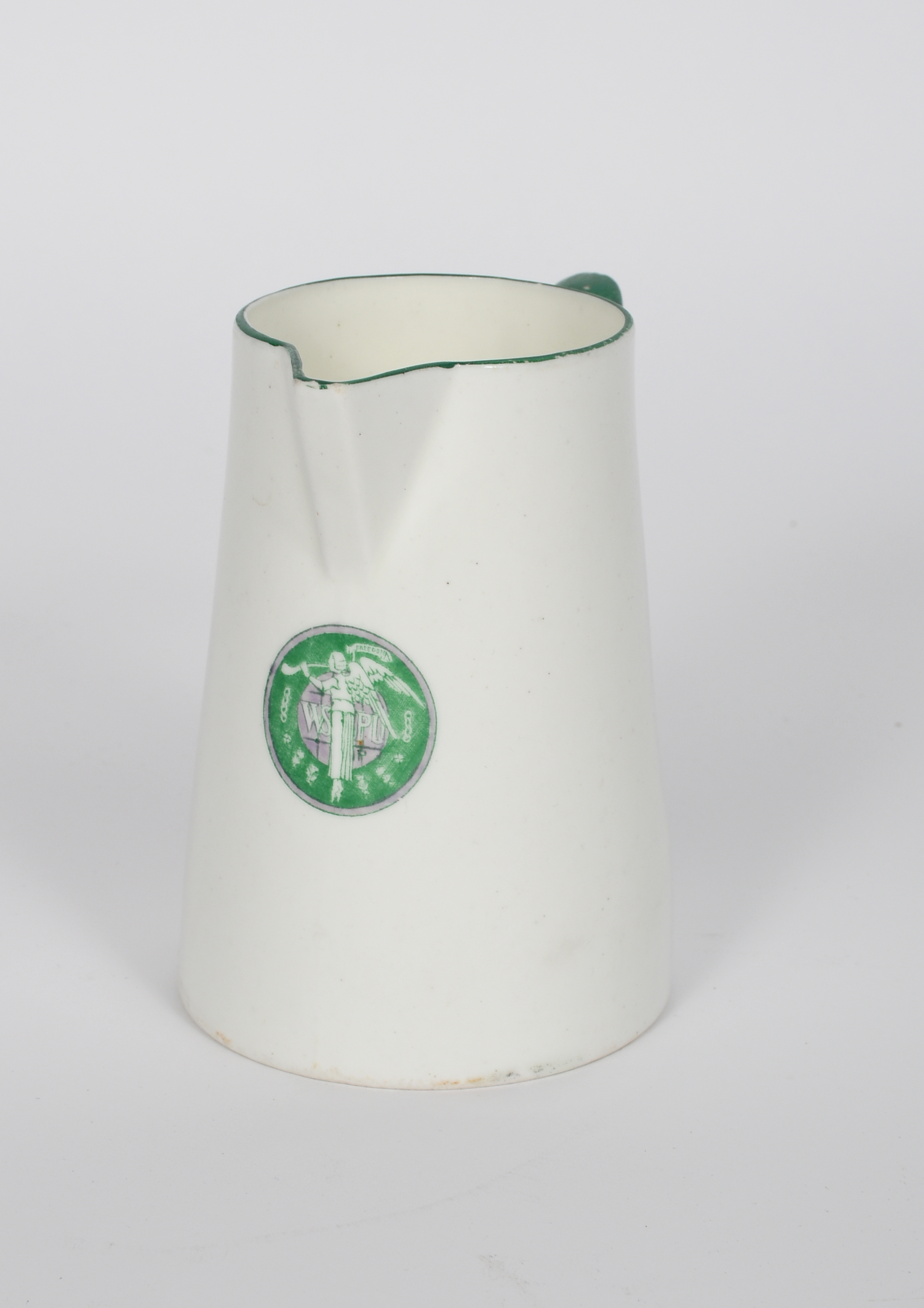 A Williamsons Longton Suffrage milk-jug, printed with the Suffragette WSPU trumpeting angel roundel for the Women's Social and Political Union, in green and violet below the spout, printed factory mark, 13cm. high