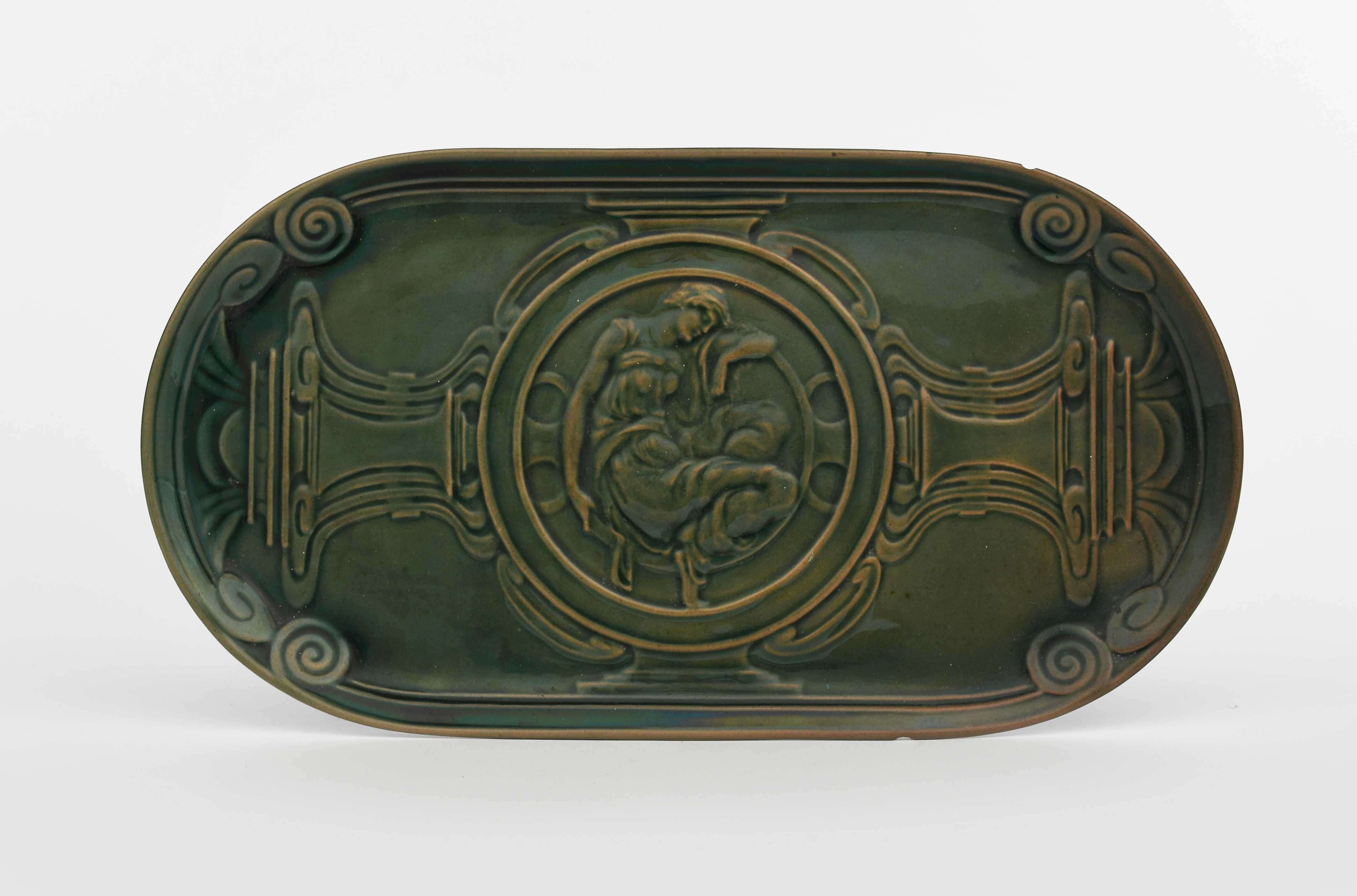 A PIlkington's Lancastrian tray, rounded rectangular form, cast in low relief with classical maiden resting, covered in a translucent green glaze, printed early Bee mark, small chip to rim, 33cm. wide