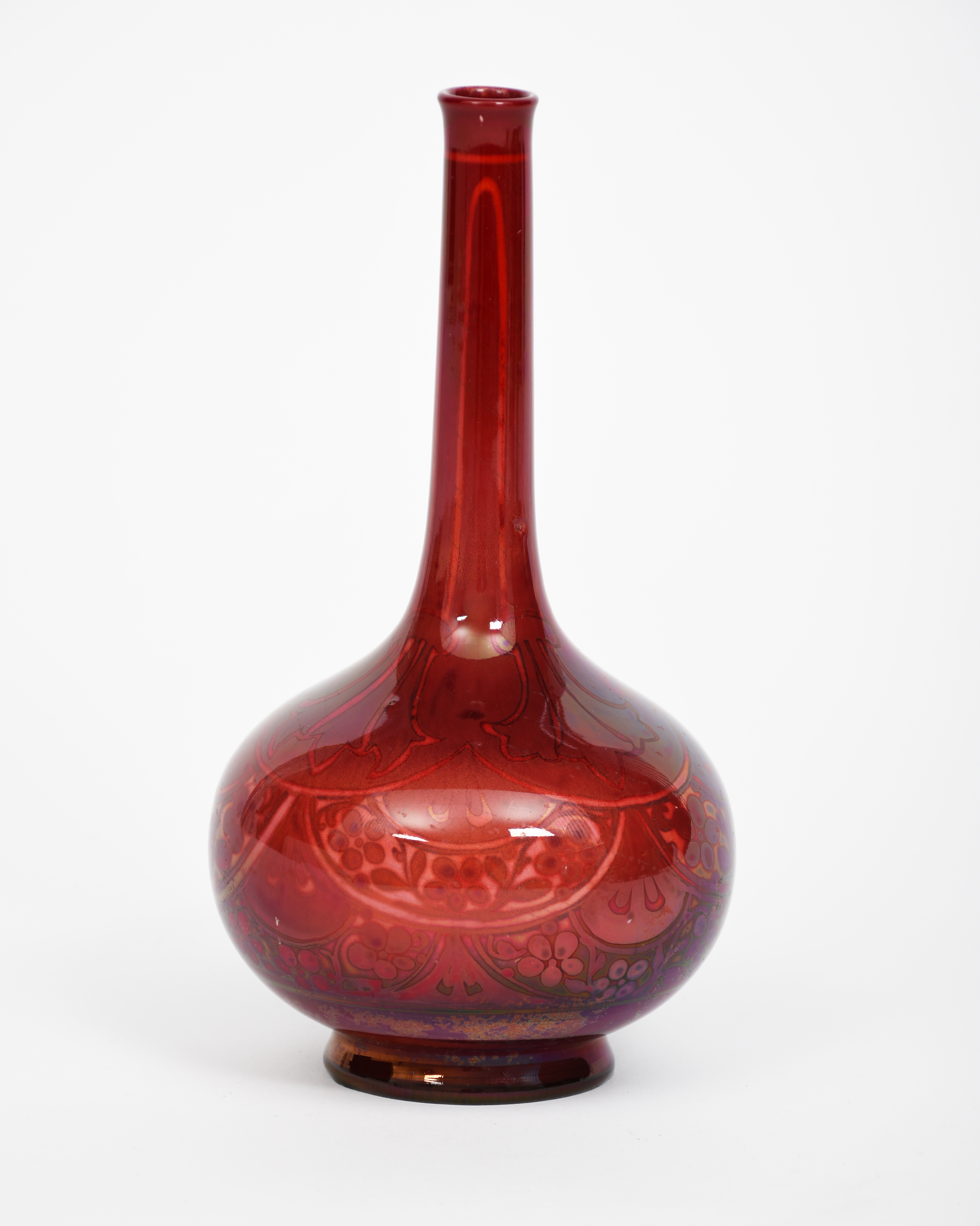 A Pilkington's Lancastrian Pottery solifleur vase by William S Mycock, dated 1913, ovoid body with tapering slender neck, painted with a band of scrolling flowers and foliage below palmette to the neck in a ruby glaze impressed mark, painted artist cipher and date mark, 19.5cm. high.