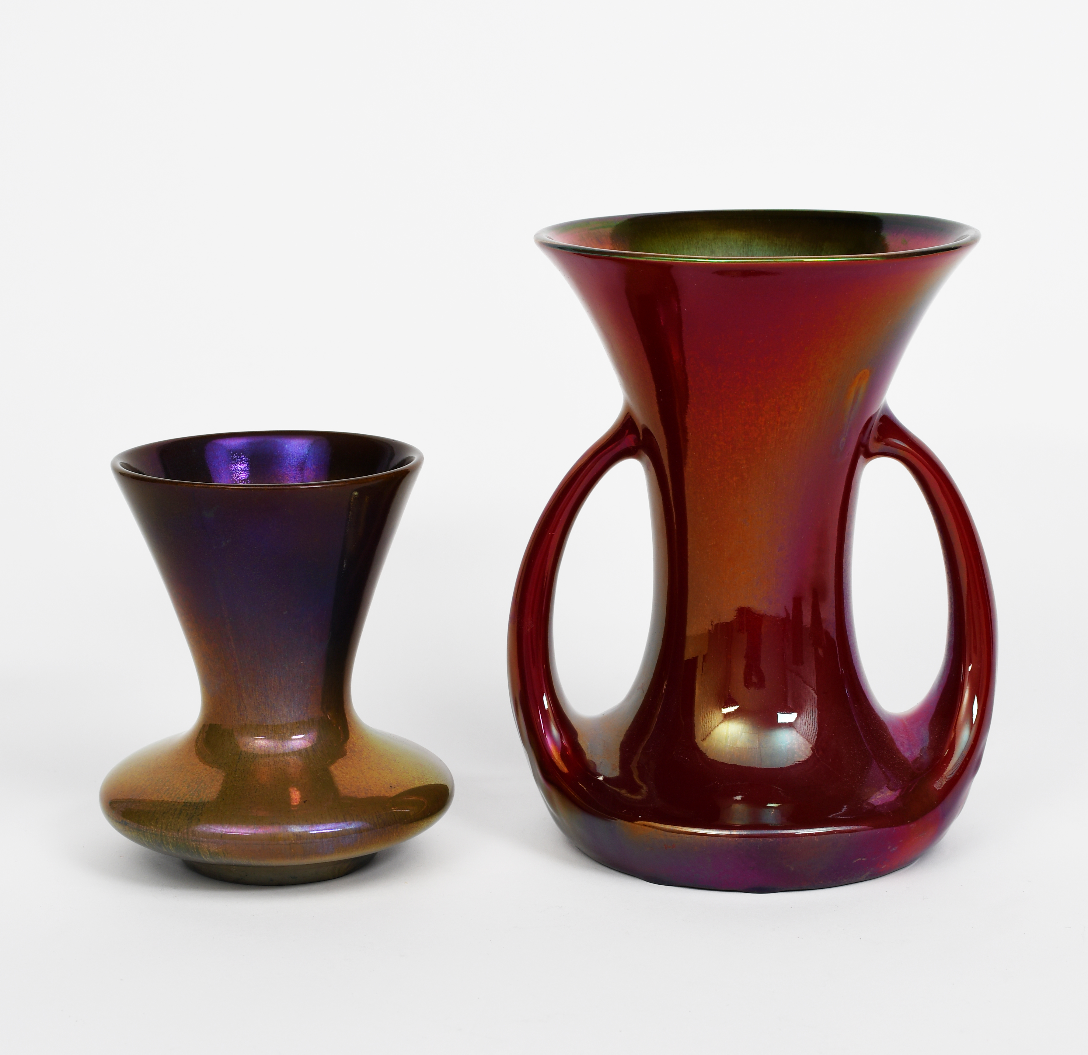 A Pilkington's Lancastrian Pottery twin-handled vase, shape no.2805, covered in a vivid red lustre glaze, the interior glazed gold, an early Pilkington's vase with a golden, finely streaked glaze over red, a streaked red and blue canister and three red lustre bowls impressed marks, 21cm. high (6)