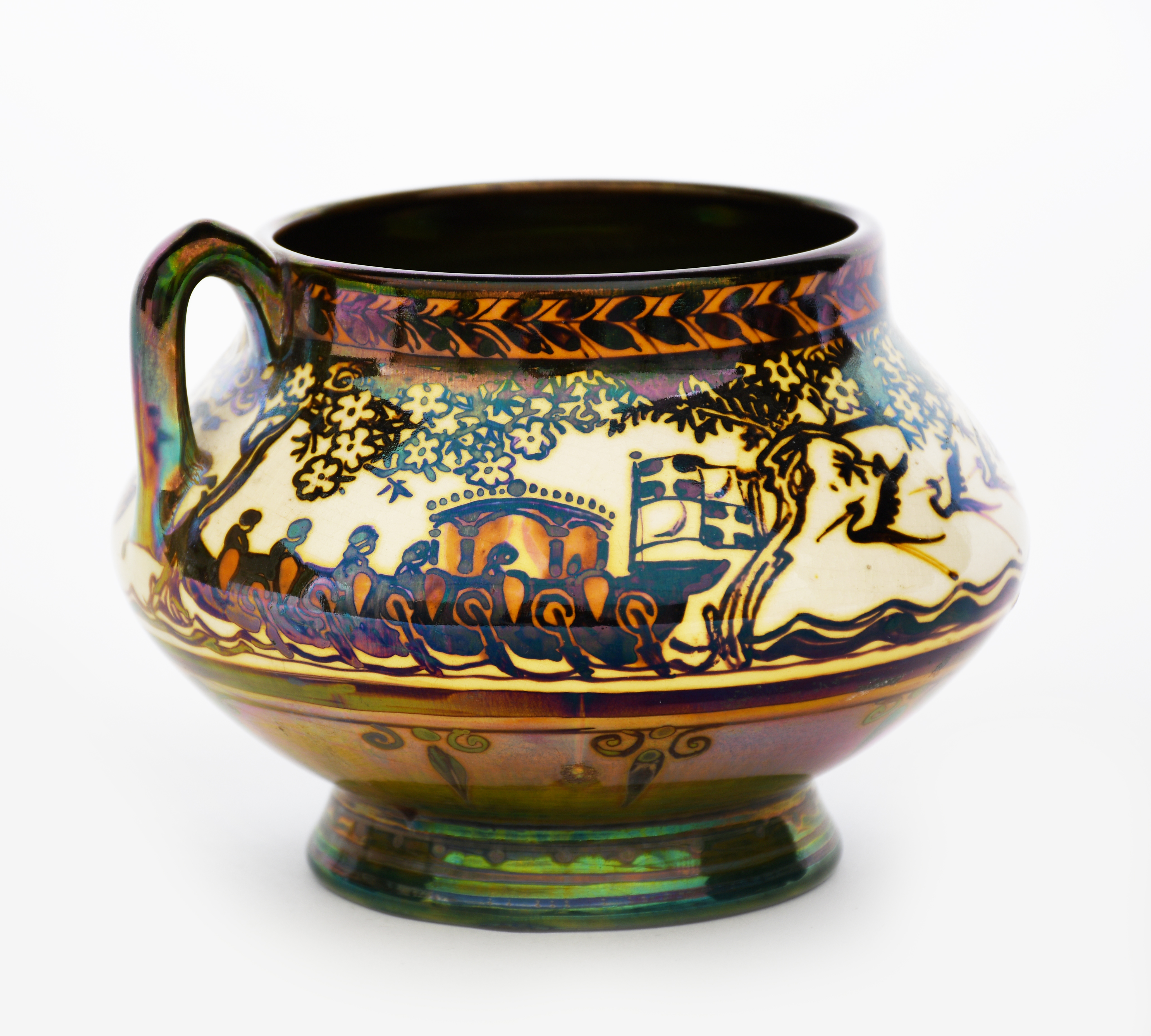 A Pilkington's Lancastrian Pottery single-handled vase, dated 1912, compressed ovoid body with collar rim, painted with three medieval long boats, inter-spaced with a flock of flying cranes, the foreground flowering trees, in copper lustre on a cream ground, the neck with a band of laurel, impressed marks, painted date 1912 artists monogram E A P, 11.5cm. high