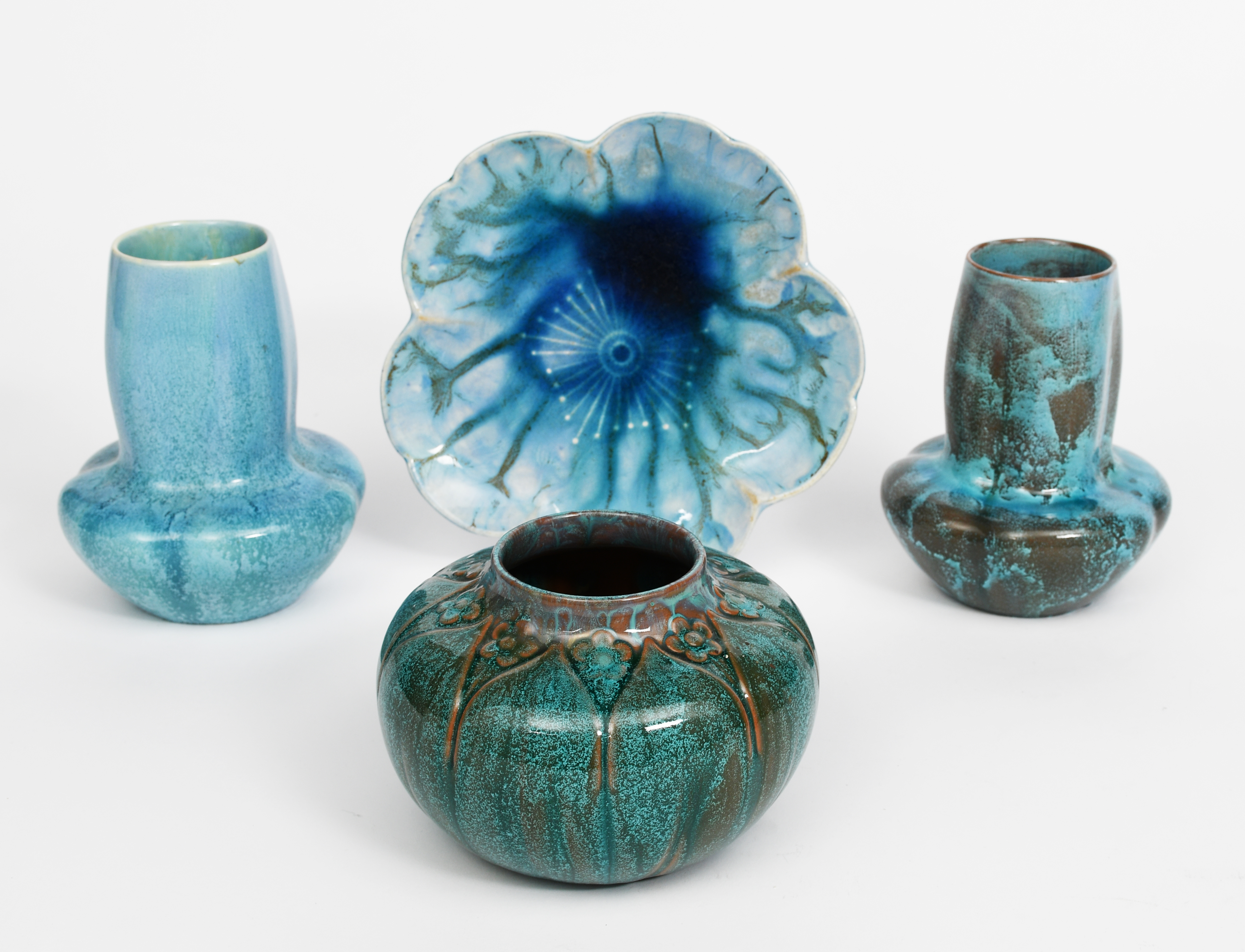 An early Pilkington's Lancastrian Pottery vase, shouldered form, shape no.2888, cast with large leaves forming the body of the vase the shoulder with simple small flowerheads, under an opalescent clouded turquoise glaze, two Pilkington's vases with similar sky blue glazes and a flower shaped dish covered in a streaked opalescent blue glaze, impressed marks, 11cm. high, (4)