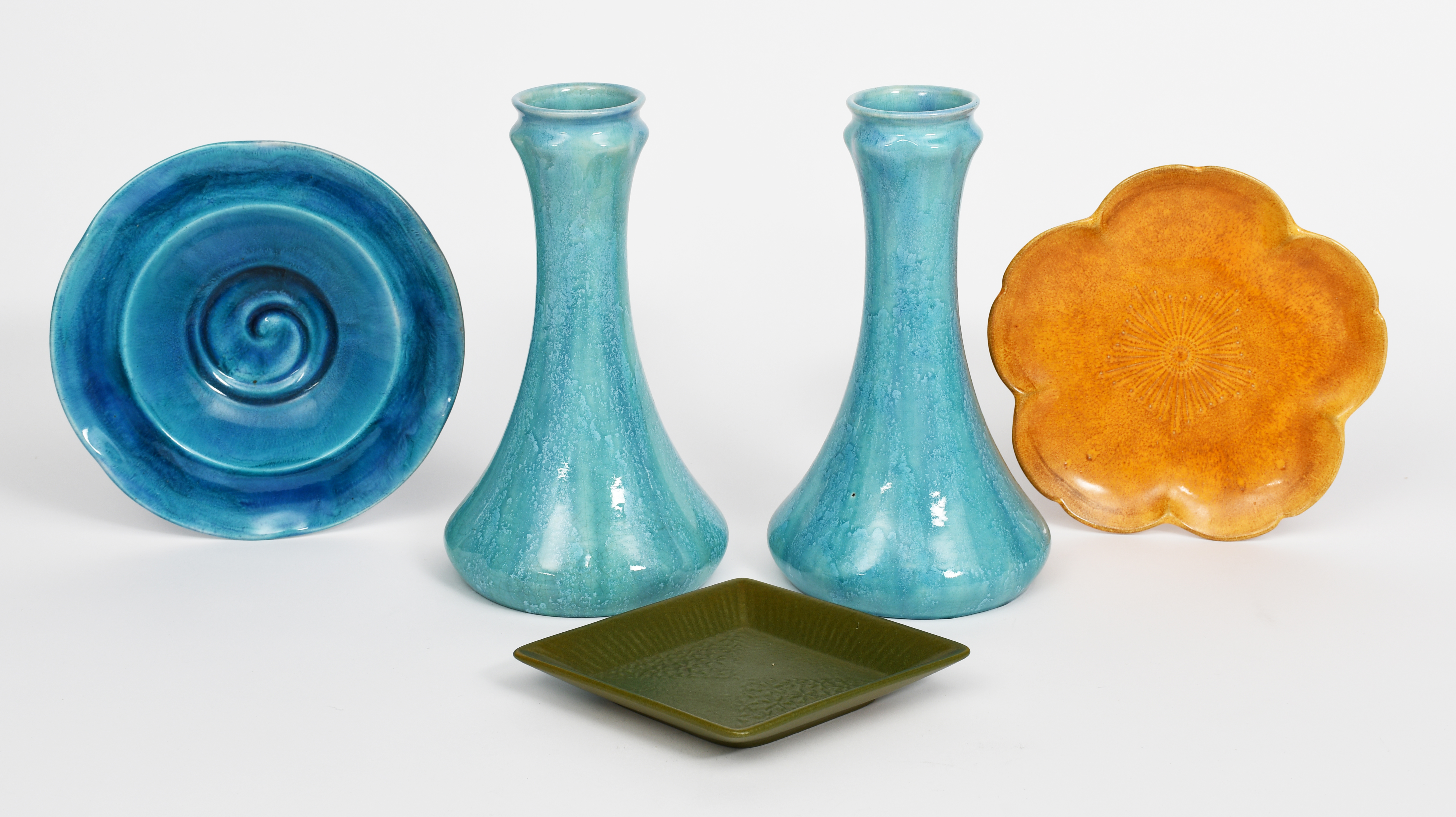 A pair of early Pilkington's Lancastrian Pottery vases, dated 1910, model no.2786, tapering cylindrical form with knopped neck, covered in a curdled turquoise blue glaze, a Pilkington's flower shaped dish covered in an aventurine and orange glaze, a small olive green diamond shaped dish and a blue bowl, impressed marks, 26.5cm. high (5)