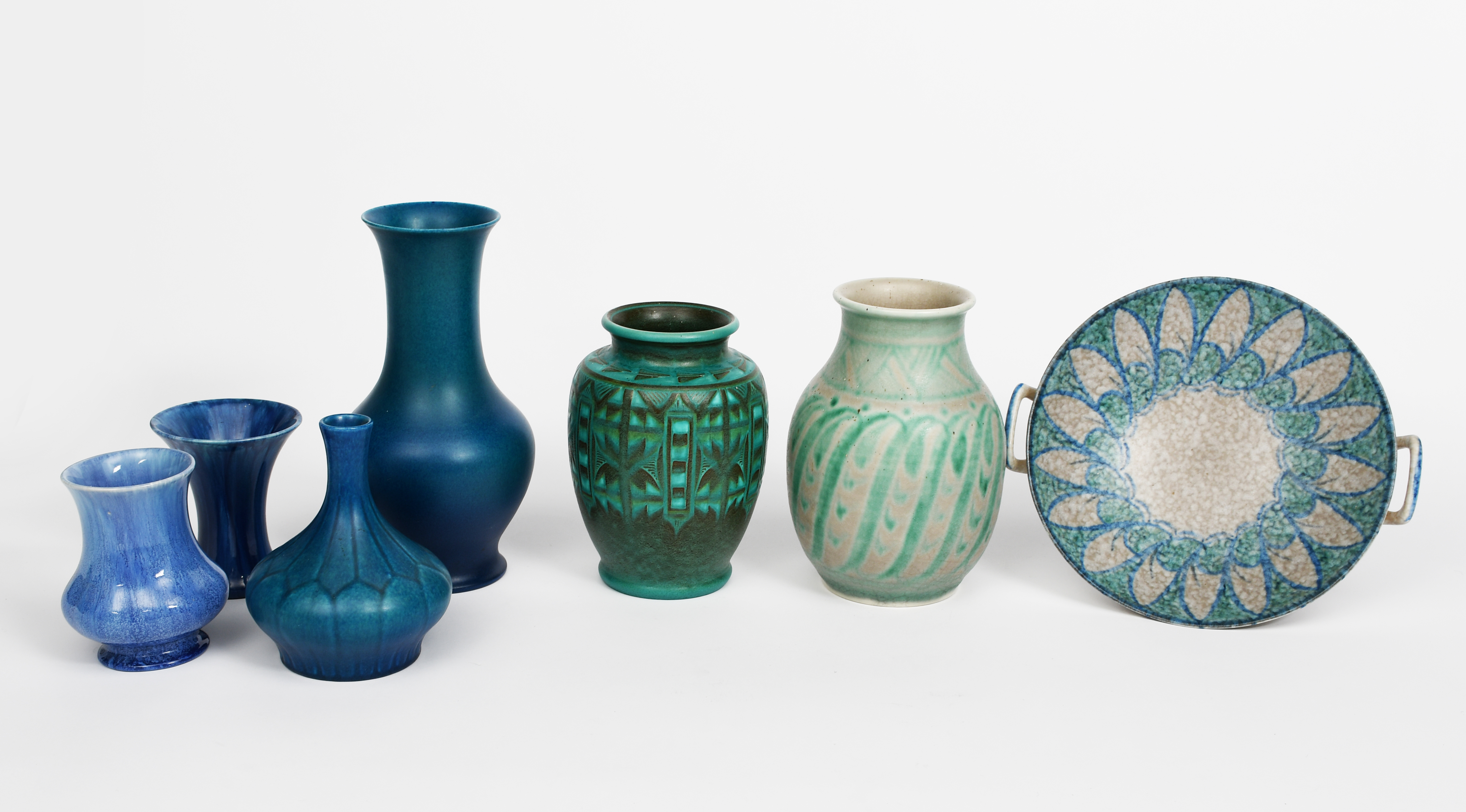 A Pilkington's Royal Lancastrian Pottery Lapis vase by Richard Joyce, shouldered form painted with stylised foliage band below chevron in turquoise on a matt silver-grey ground, a Pilkington's Lancastrian Lapis tazza by Gladys Rogers, a vase by William S Mycock and five other blue glazed pots impressed marks, painted artist cipher, 23cm. high, (7)